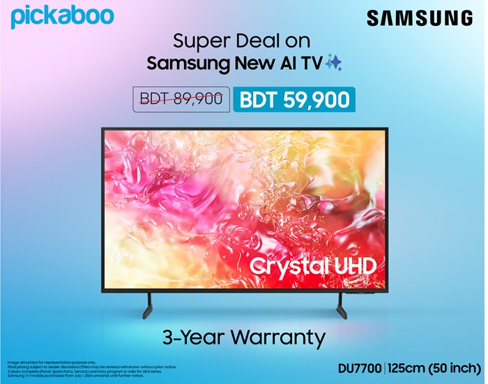 যারা নতুন এন্টারটেইনমেন্ট সল্যুশন খুঁজছেন, তারা আর অপেক্ষা না করে পিকাবু থেকে সেরা দামে বিশ্বসেরা ব্র্যান্ডের প্রযুক্তিগতভাবে সর্বাধুনিক আপডেটেড টিভি নিয়ে নিন।” স্যামসাং DU7700 মডেলের ৫০ ইঞ্চি টিভির মূল্য ৮৯,৯০০ টাকা। তবে, পিকাবু থেকে অফার মূল্যে ৫৯,৯০০ টাকায় কেনা যাবে টিভিটি।