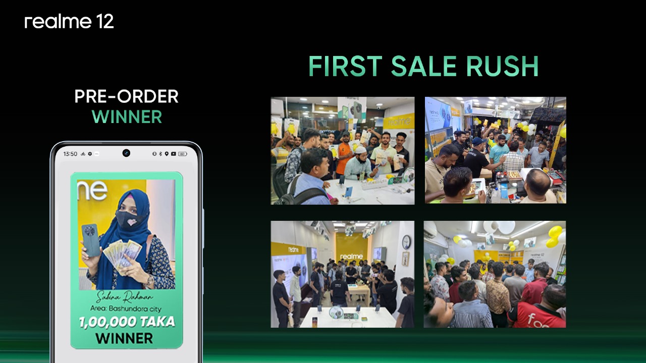 নিজস্ব প্রতিবেদকঃ তরুণদের জনপ্রিয় স্মার্টফোন ব্র্যান্ড রিয়েলমি গ্রাহকদের বহুল প্রতীক্ষিত ফোন রিয়েলমি ১২-এর প্রি-অর্ডার ক্যাম্পেইনের বিজয়ীদের নাম ঘোষণা করেছে। এরই মধ্যে দারুণ ফিচারসমৃদ্ধ এই স্মার্টফোন সংগ্রহের মাধ্যমে নগদ অর্থ ও ‘একটি কিনলে একটি ফ্রি’ অফারের জন্য দেশের বিভিন্ন দোকানে ক্রেতাদের উপচে পড়া ভিড় দেখা গেছে।