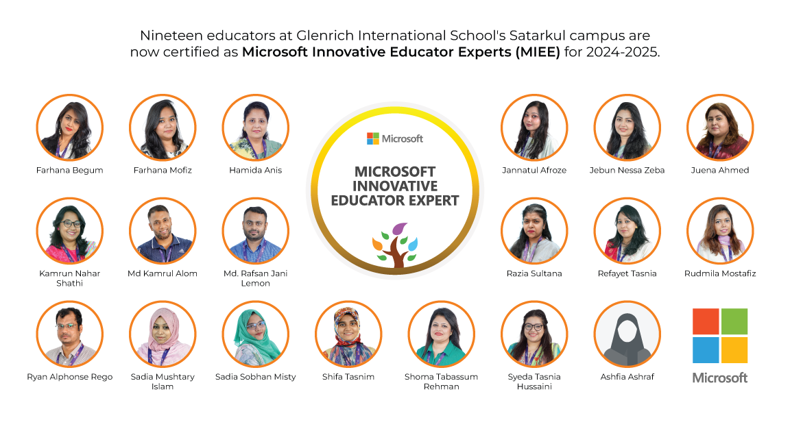 নিজস্ব প্রতিবেদকঃ ২০২৪-২৫ শিক্ষাবর্ষের মাইক্রোসফট ইনোভেটিভ এডুকেটর এক্সপার্ট (এমআইএফই) প্রোগ্রামে অংশ নিয়ে মর্যাদাপূর্ণ সনদ অর্জন করেছেন গ্লেনরিচ ইন্টারন্যাশনাল স্কুল - সাতারকুল ক্যাম্পাসের ১৯ জন শিক্ষক। শিক্ষার্থীদের প্রযুক্তি-নির্ভর শিক্ষায় সমৃদ্ধ করে তুলতে এবং অনন্য ও সহযোগিতাপূর্ণ ক্লাসরুম তৈরি করতে শিক্ষকদের সুদক্ষ করে তোলার ক্ষেত্রে গ্লেনরিচের প্রতিশ্রুতির বহিঃপ্রকাশ এই অর্জন।