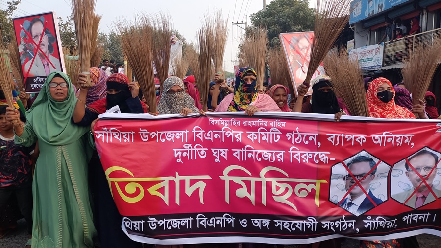 অভিযোগ করা হচ্ছে, আহ্বায়ক কমিটিতে যাদেরকে গুরুত্বপূর্ণ পদে রাখা হয়েছে তারা কেউই দলের অসময়ে সাঁথিয়ায় রাজনীতির মাঠে ছিলেন না। তার মাঝে আহ্বায়ক খায়রুন নাহার খানম মীরু তিনি অন্য উপজেলার বাসিন্দা। আর সদস্য সচিব তিনি দীর্ঘদিন একজন বাংলাদেশ পুলিশে কর্মরত ছিলেন। হঠাৎ করে উড়ে এসে জুড়ে বসার ন্যায় এই কমিটির বিরুদ্ধে প্রতিবাদ করেছে উপজেলার নেতাকর্মীরা। অনিয়ম, দূর্নীতি ও ঘুষ বানিজ্যর অভিযোগ নিয়ে শুক্রবার বিকাল ৪ টায় ঝাড়ু মিছিল ও জেলা কমিটির আহ্বায়ক হাবিবুর রহমান হাবিব ও সদস্য সচিব এ্যাডভোকেট মাসুদ খন্দকারের কুশপুত্তলিকা দাহন করেছে বিক্ষোভকারী নেতাকর্মীরা।