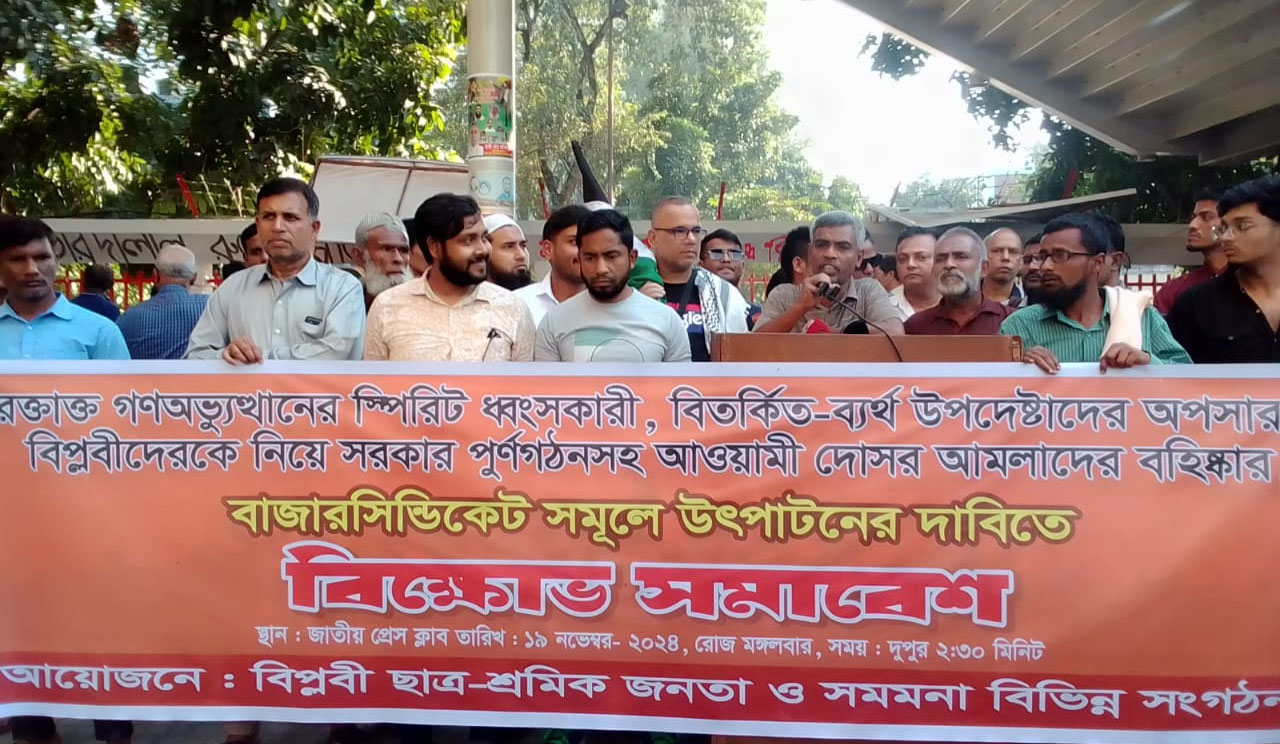 সভাপতির বক্তব্যে বিপ্লবী ছাত্র—শ্রমিক জনতার প্রধান সংগঠক ঢাকা বিশ্ববিদ্যালয়ের সাবেক ছাত্রনেতা আবু তৈয়ব হাবিলদার বলেন, ড. ইউনূস সরকার জনগণের সরকার নয়, বিপ্লবীদের সরকারও নয়। গত ৩ মাসে ইউনূস সরকার জনগণের পক্ষে সরকার পরিচালনায় চরমভাবে ব্যর্থ হয়েছে। বাজার সিন্ডিকেট উৎখাত না করা, আইনশৃঙ্খলা পরিস্থিতির অবনতি, আওয়ামী ও ভারতপন্থী অযোগ্য লোকজনকে দিয়ে সরকার গঠন, দুর্নীতিবাজ ও ফ্যাসিস্ট আওয়ামী আমলাদের দিয়ে রাষ্ট্র পরিচালনার মধ্য দিয়ে আওয়ামী পুনর্বাসন করে গণঅভ্যুত্থানকারী ছাত্র—শ্রমিক, প্রবাসীদের এবং আপমর জনসাধারণকে চরম ঝুঁকির মধ্যে ফেলে দিয়েছেন ইতিমধ্যেই। সেই সুযোগে ভারতের পৃষ্ঠপোষকতায় ফ্যাসিবাদী আওয়ামী লীগ বাংলাদেশে ঢুকে দেশকে অস্থিতিশীল করার অপচেষ্টা চালিয়ে যাচ্ছে।