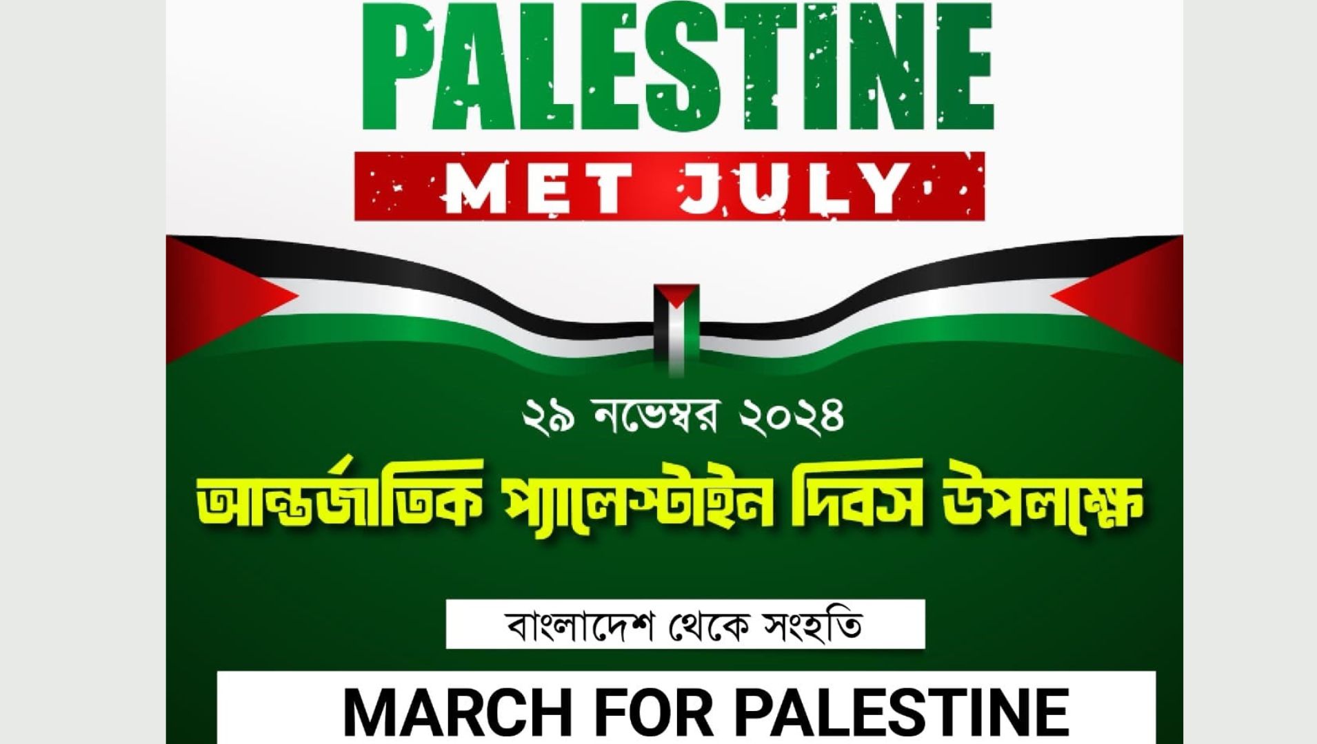 ঢাকা বিশ্ববিদ্যালয়ের রাজু ভাস্কর্যে বিকেল তিনটার দিকে এ কর্মসূচির ডাক দেয়া হয়। এতে দেশের সর্ববৃহৎ ফিলিস্তিন পতাকা নিয়ে মিছিল করা হবে বলে জানানো হয়।