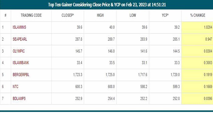 সাপ্তাহিক দর বৃদ্ধির শীর্ষ তালিকায় উঠে আসা অন্যান্য কোম্পানিগুলোর মধ্যে ইনট্রাকো রিফুয়েলিংয়ের ২১.২১ শতাংশ, এইচ. আর. টেক্সটাইলের ১৯.২৬ শতাংশ, ডরিন পাওয়ারের ১৬.৯৫ শতাংশ, বাংলাদেশ ইন্ডাস্ট্রায়াল ফাইন্যান্সের ১৬.৬৭ শতাংশ, জেনেক্স ইনফোসিসের ১৫.৭৫ শতাংশ, এনআরবি ব্যাংকের ১৫.৩২ শতাংশ, সোনারগাঁও টেক্সটাইলের ১৪.৯০ শতাংশ, মেট্রো স্পিনিংয়ের ১৪.৪৪ শতাংশ এবং সাফকো স্পিনিং মিলস লিমিটেডের ১২.৭৯ শতাংশ শেয়ার দর বেড়েছে।