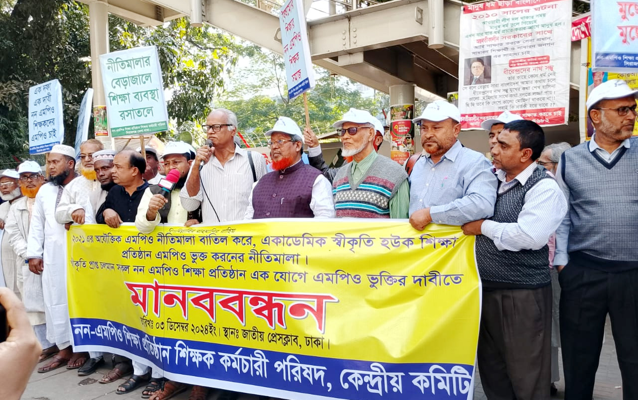 মানববন্ধনে অন্যান্য বক্তারা বলেন, বিগত ফ্যাসিবাদী সরকার ২০২১ সালে অযৌক্তিক এমপিও নীতিমালা ও জনবল কাঠামো দিয়ে বৈষম্য সৃষ্টির মাধ্যমে হাজারো শিক্ষাপ্রতিষ্ঠানকে এমপিও বঞ্চিত করেছে। অথচ স্বীকৃতিপ্রাপ্ত প্রতিষ্ঠানগুলো ২০-২৫ বছর ধরে এমপিও বিহীন থাকা সত্ত্বেও শিক্ষক-কর্মচারীরা নিরলস ভাবে পাঠদান কর্মসূচি চালিয়ে গেছেন এবং জাতীয় শিক্ষায় গুরুত্বপূর্ণ অবদান রেখে চলেছেন। বিগত আওয়ামী লীগ সরকারের আমলে বিএনপি-জামায়াত রাজনৈতিক ট্যাগ লাগিয়ে অনেক যোগ্য প্রতিষ্ঠানকে এমপিও থেকে বঞ্চিত করা হয়েছে। ফ্যাসিস্ট সরকারের দোসরদের এবং শেখ পরিবারের নামে যেসকল প্রতিষ্ঠান ছিল সেগুলো এমপিওভুক্ত করেছেন। বর্তমান সরকারের কাছে আমাদের আকুল আবেদন সকল বৈষম্য দূর করে স্বীকৃতি প্রাপ্ত নন-এমপিও সকল প্রতিষ্ঠান (স্কুল, কলেজ, মাদ্রাসা, কারিগরি ও ডিগ্রী কলেজ) একযোগে এমপিওভুক্ত করণের জন্য অনুরোধ করছি।