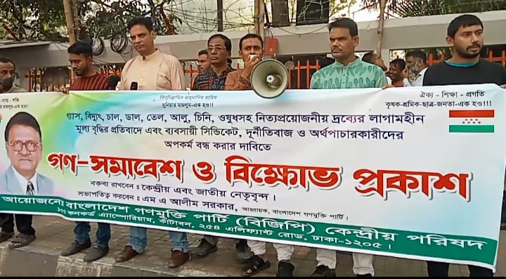 নিজস্ব প্রতিবেদকঃ বাংলাদেশ গণমুক্তি পার্টির উদ্যোগে ৬ ডিসেম্বর শুক্রবার সকালে জাতীয় প্রেসক্লাবের সামনে গ্যাস, বিদ্যুৎ, চাল, ডাল, তেল, আলু, চিনি, ঔষধসহ নিত্যপ্রয়োজনীয় দ্রব্যের লাগামহীন মূল্যবৃদ্ধির প্রতিবাদে এবং ব্যবসায়ী সিন্ডিকেট, দুর্নীতিবাজ ও অর্থপাচারকারীদের অপকর্ম বন্ধ করার দাবিতে গণ-সমাবেশ ও বিক্ষোভ প্রকাশ অনুষ্ঠিত হয়।