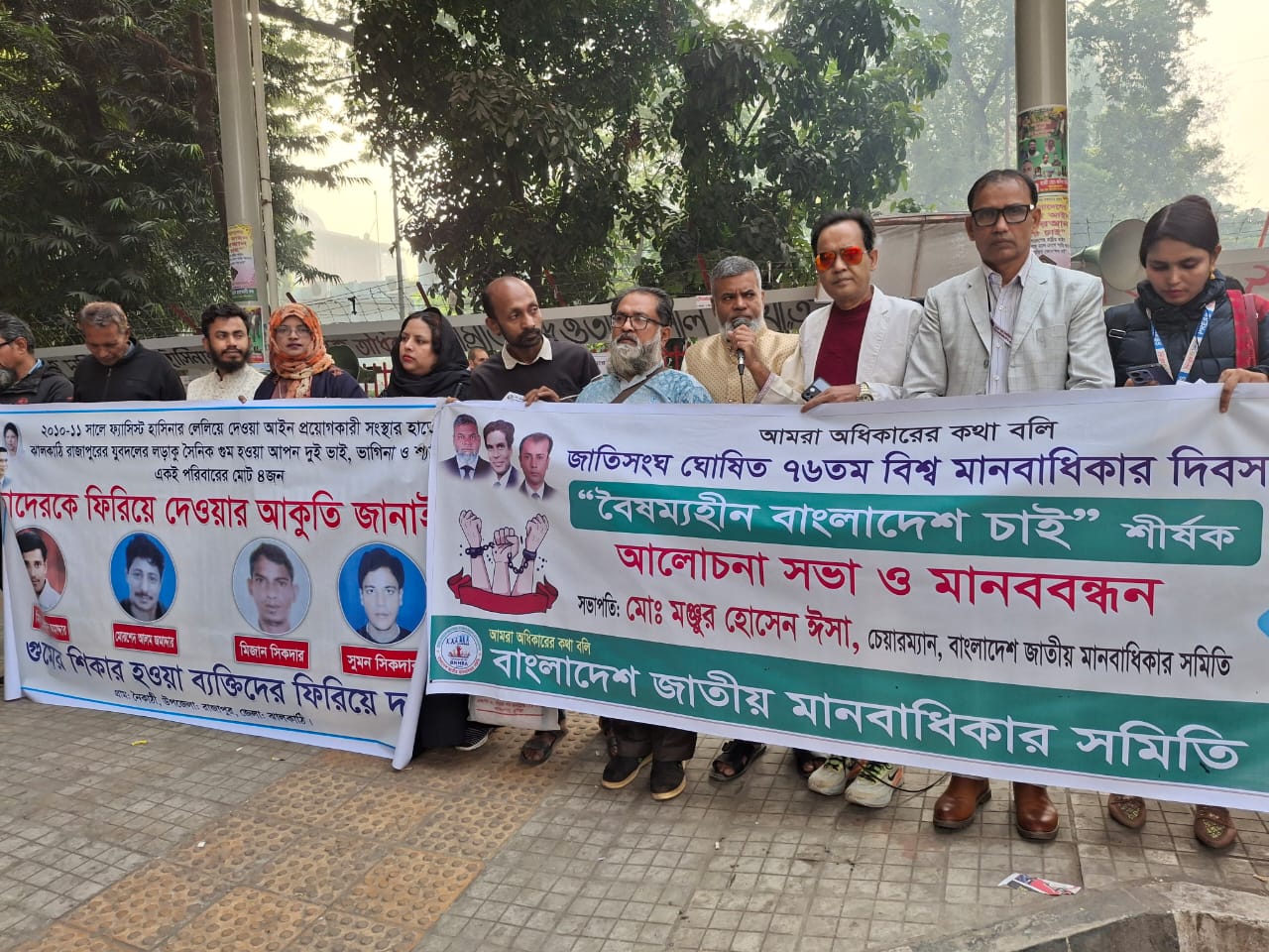 মঙ্গলবার (১০ ডিসেম্বর) জাতীয় প্রেসক্লাবের সামনে আন্তর্জাতিক মানবাধিকার দিবস উপলক্ষে বাংলাদেশ জাতীয় মানবাধিকার সমিতি আয়োজিত মানববন্ধন কর্মসূচীতে সংহতি প্রকাশ করে তিনি এসব কথা বলেন।