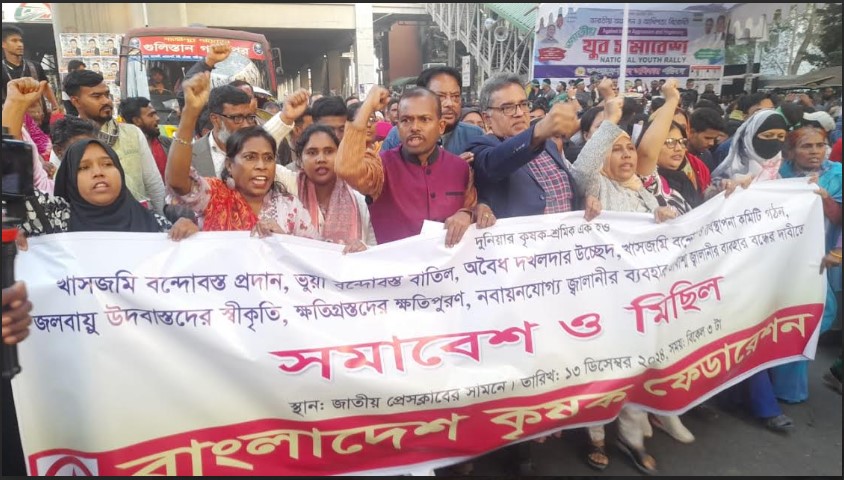 নিজস্ব প্রতিবেদকঃ ৯ দফা দাবীতে ঢাকার জাতীয় প্রেসক্লাবের সামনে বাংলাদেশ কৃষক ফেডারেশনের উদ্যোগে ভূমি ও জলবায়ু বিষয়ক সমাবেশ ও মিছিল অনুষ্ঠিত হয়। মিছিলটি ঢাকার বিভিন্ন সড়ক প্রদক্ষিণ করে।