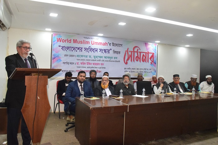 নিজস্ব প্রতিবেদকঃ আজ ১৪ই ডিসেম্বর রোজ শনিবার সকাল ১০ টায় প্রেসক্লাবের জহুর হোসেন চৌধুরী হলে "বাংলাদেশের সংবিধান সংস্কার" বিষয়ক এক সেমিনার অনুষ্ঠিত হয়। সেমিনারে প্রধান মেহমান হিসাবে উপস্থিত ছিলেন বাংলাদেশ রেড ক্রিসেন্ট সোসাইটির সাবেক চেয়ারম্যান ও মানারাত ইন্টারন্যাশনাল ইউনিভার্সিটির ভি,সি অধ্যাপক ড. মুহাম্মদ আবদুর রব, অনুষ্ঠানের মূল প্রবন্ধ উপস্থাপন ও সভাপতিত্ব করেন ওয়ার্ল্ড মুসলিম উম্মাহর সাধারণ সম্পাদক চক্ষু বিশেষজ্ঞ ডা. ফরিদ উদ্দিন আহমাদ খান।