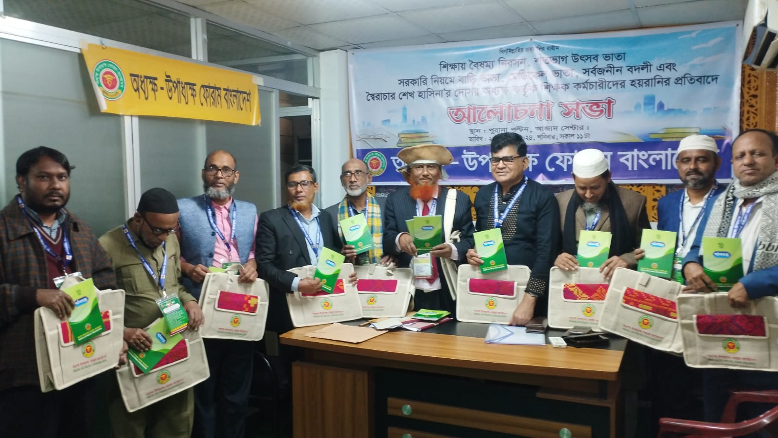 দাবিগুলো হলো: ০১/অবিলম্বে বোর্ড সমুহে চেয়ারম্যান, পরীক্ষা নিয়ন্ত্রক সহ শূন্য পদ পূরণ করে বোর্ড সমুহে, বিদ্যালয় ও কলেজ পরিদর্শক সমুহ সচল করে কলেজে ও মাদরাসার কার্যক্রম পরিচালনায় সহযোগিতা করার দাবি জানান হয়। ০২/নিরীক্ষা অধিদপ্তর কর্তৃক বিভিন্ন স্কুল কলেজ ও মাদরাসায় পরিদর্শনের নামে তিন এমপিও দুই এমপিওর টাকা পরিদর্শকরা দাবি করে কঠিন চাপ সৃষ্টি করেন, ডাকাতির ন্যায় ঘুষ দাবি বন্ধ করার দাবি জানানহয় অন্যথায় শিক্ষক কর্মচারি সমাজ ঘুস বন্ধের দাবিতে ঐক্যবদ্ধ হয়ে প্রতিরোধ করতে বাধ্য হবে, তাই নীরিক্ষা অধিদপ্তরের ঘুস বন্ধের দাবি জানানো হয়। ০৩/এমপিও ভুক্তির জন্য মোটা অঙ্কের অর্থ দাবি করেন কর্মকর্তারা, পরিচালক ও ডিডি কে অর্থ না দিলে এমপিও ভুক্ত না করে শিক্ষক কর্মচারিদের থেকে লক্ষ লক্ষ টাকা জোর পূর্বক আদায় করেন এমপিওভুক্ত করার কর্মকর্তারা, ডিডি অফিসের ঘুস বন্ধ করার ব্যবস্থা গ্রহণের দাবি জানান হয়। ০৪/অবিল্বে কল্যাণ ট্রাস্ট ও অবসর বোর্ডের সদস্যদের পদায়ন করে অবসর কল্যাণে পর্যাপ্ত অর্থ বরাদ্দ করে অবসর প্রাপ্ত শিক্ষকদের সমস্যার সমাধানের জোর দাবি জানান হয়। ০৫/ যে সমস্ত কলেজে অধ্যক্ষ নেই বেআইনি ভাবে ভয় দেখিয়ে বিতাড়িত করা হয়েছে,স্বৈরাচার শাসনের অনেক জুনিয়র দলীয় ক্যাডারকে অধ্যক্ষ পদে বসিয়ে লুটপাট করেছেন ঐ সমস্ত কলেজে অবিলম্বে অধ্যক্ষ নিয়োগ এবং স্বৈরাচারীদের দোসরদের অপসারণের দাবি জানান হয়। ০৬/ শিক্ষক প্রশিক্ষণ কলেজের শিক্ষক কর্মচারিদের এমপিওভুক্ত করার দাবি জানান হয়। ০৭/ অনার্স পাঠদান কারি শিক্ষক কর্মচারিদের এমপিওভুক্ত করার দাবি জানান হয় অনার্স মাস্টার্স পাঠদান কারি শিক্ষক সমাজ চরম বৈষম্যের কারণে তারা আন্দোলনে নামতে বাধ্য হবে , তাই অবিলম্বে তাদেরকে এমপিওভুক্ত করার দাবি জানান হয়। ০৮/স্বৈরাচার শেখ হাসিনার দোসর কতিপয় অধ্যক্ষ কর্তৃক শিক্ষক কর্মচারিদের হয়রানির তীব্র নিন্দা এবং হয়রানি বন্ধের দাবি জানান হয় এবং অভিযুক্ত স্বৈরাচারদের দোসর অধ্যক্ষদের বিচারের মুখোমুখি করার দাবি জানানো হয়। ০৯/ প্রাথমিক বিদ্যালয়ে অবিলম্বে ধর্মীয় শিক্ষক নিয়োগের দাবি জানানো হয়, কেননা প্রাথমিক বিদ্যালয় হিন্দু শিক্ষক ইসলাম ধর্ম শিক্ষা পড়ায় , যত তাড়াতাড়ি সম্ভব প্রাথমিক বিদ্যালয় ধর্ম শিক্ষক নিয়োগ দেওয়ার দাবি জানানো হয়। ১০/ মাধ্যমিক বিদ্যালয় হেড মাওলানা ও সহকারি মৌলভী পূর্বে ছিল,পূর্বের ন্যায় হাই স্কুলে হেড মাওলানা ও সহকারী মৌলুভী নিয়োগ দানের দাবি জানানো হয়। ১১/ অবিলম্বে সকল উচ্চ মাধ্যমিক পর্যায়ে শিক্ষা প্রতিষ্ঠানে ইসলাম শিক্ষা বিষয় খোলার অনুমোদন ও ইসলাম ধর্ম শিক্ষা বাধ্যতামূলক করার দাবি জানানো হয়। ১২/ গত ৫১ বছরে একটি ই