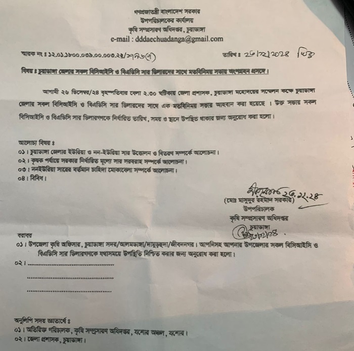 কৃষি সম্প্রসারণ অধিদপ্তরের উপপরিচালক মো. মাসুদুর রহমান সরকারের স্বাক্ষরিত পত্রে উক্ত সভার বিষয়ে জানানো হয়। সভায় নির্ধারিত তারিখ, সময় ও স্থানে সংশ্লিষ্ট সকল ডিলারদের উপস্থিতি নিশ্চিত করার জন্য অনুরোধ করা হয়েছে।