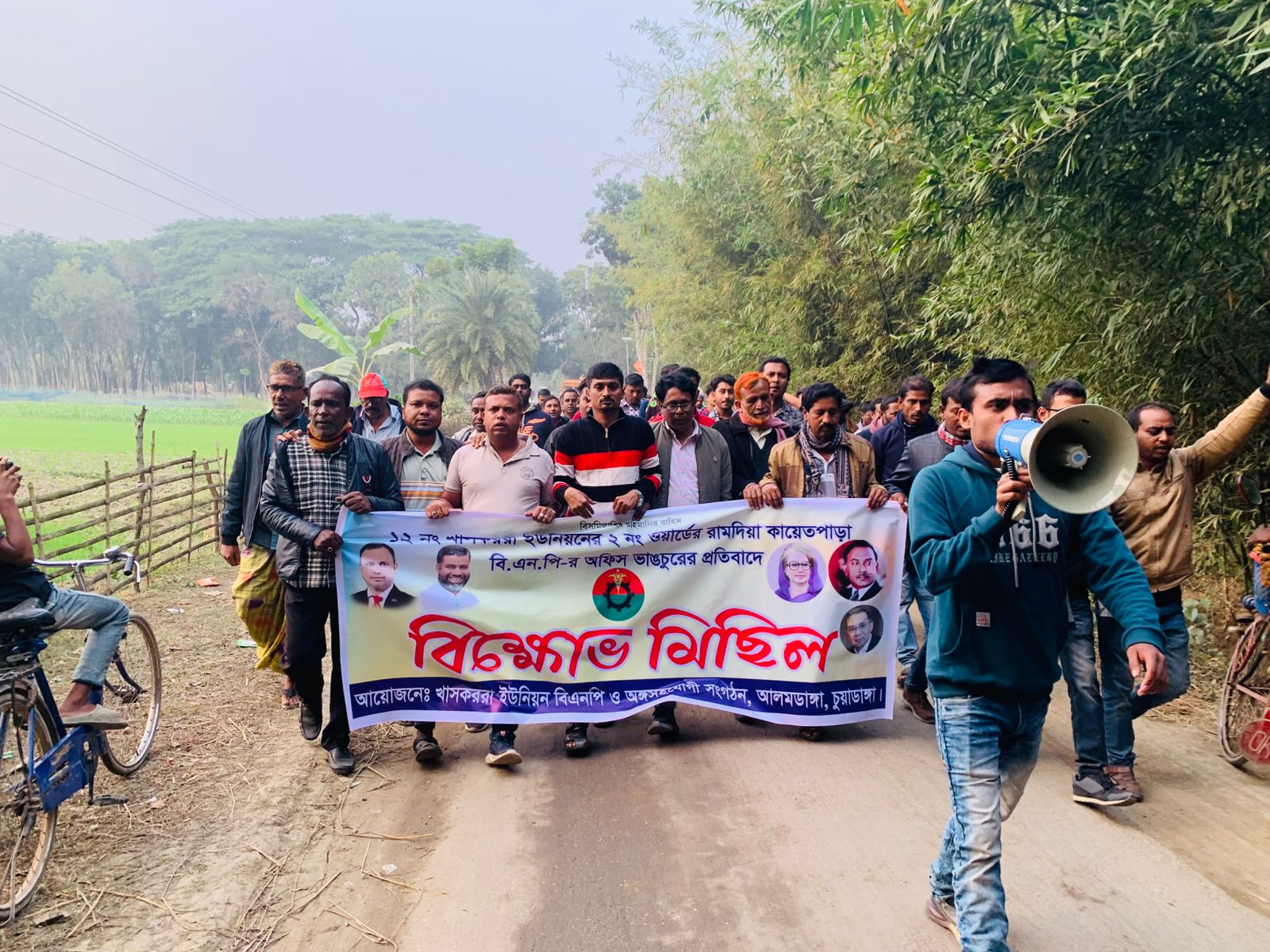 নিজস্ব প্রতিবেদকঃ চুয়াডাঙ্গার আলমডাঙ্গা উপজেলার ১২ নং খাসকররা ইউনিয়নের ২ নং ওয়ার্ডের রামদিয়া কায়েতপাড়ায় বিএনপি অফিসে হামলা, ভাঙচুর ও লুটপাটের প্রতিবাদে সোমবার বিকেল ৩টায় বটতলা মোড়ে খাসকররা ইউনিয়ন বিএনপি ও এর অঙ্গসংগঠনের আয়োজনে এক বিক্ষোভ মিছিল অনুষ্ঠিত হয়।