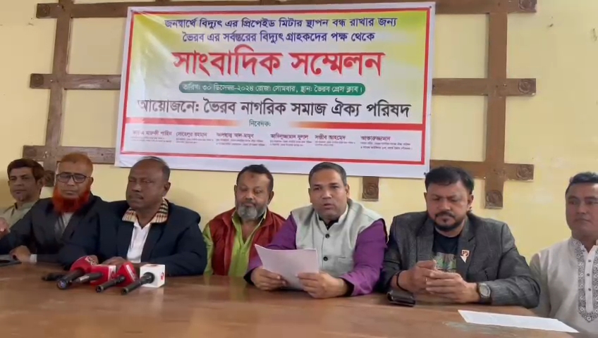 ভৈরব(কিশোরগঞ্জ)প্রতিনিধি: কিশোরগঞ্জের ভৈরবে প্রি-পেইড মিটার স্থাপনের বিরুদ্ধে সংবাদ সম্মেলন অনুষ্টিত হয়েছে।