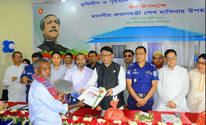 উল্লেখ, দিনাজপুর জেলায় মোট ১০ হাজার ৬১৮টি ভুমিহীন ও গৃহহীন পরিবারকে জমিসহ নতুন বাড়ী উপহার দেয়া হবে। এর মধ্যে প্রথম পর্যায়ে ৪ হাজার ৭৬৪টি এবং দ্বিতীয় পর্যায়ে ৩ হাজার ১২৫টি নতুন বাড়ী দেয়া হয়েছে। তৃতীয় পর্যায়ে দিনাজপুর জেলায় মোট ২ হাজার ৭২৯টি ভুমিহীন ও গৃহহীন পরিবারকে নতুন বাড়ী দেয়া হবে। এর মধ্যে মঙ্গলবার (২৬ এপ্রিল)জেলায় ১ হাজার ৮৫৬টি পরিবারকে নতুন বাড়ী দেয়া হয়। এর মধ্যে সদর উপজেলায় ৭০ জন ভুমিহীন ও গৃহহীন পরিবারকে জমি ও গৃহ হস্তান্তর করা হয়। পরবর্তীতে সদরে আরও ১৫০জন ভুমিহীন ও গৃহহীন পরিবারকে হস্তান্তর করা হবে।