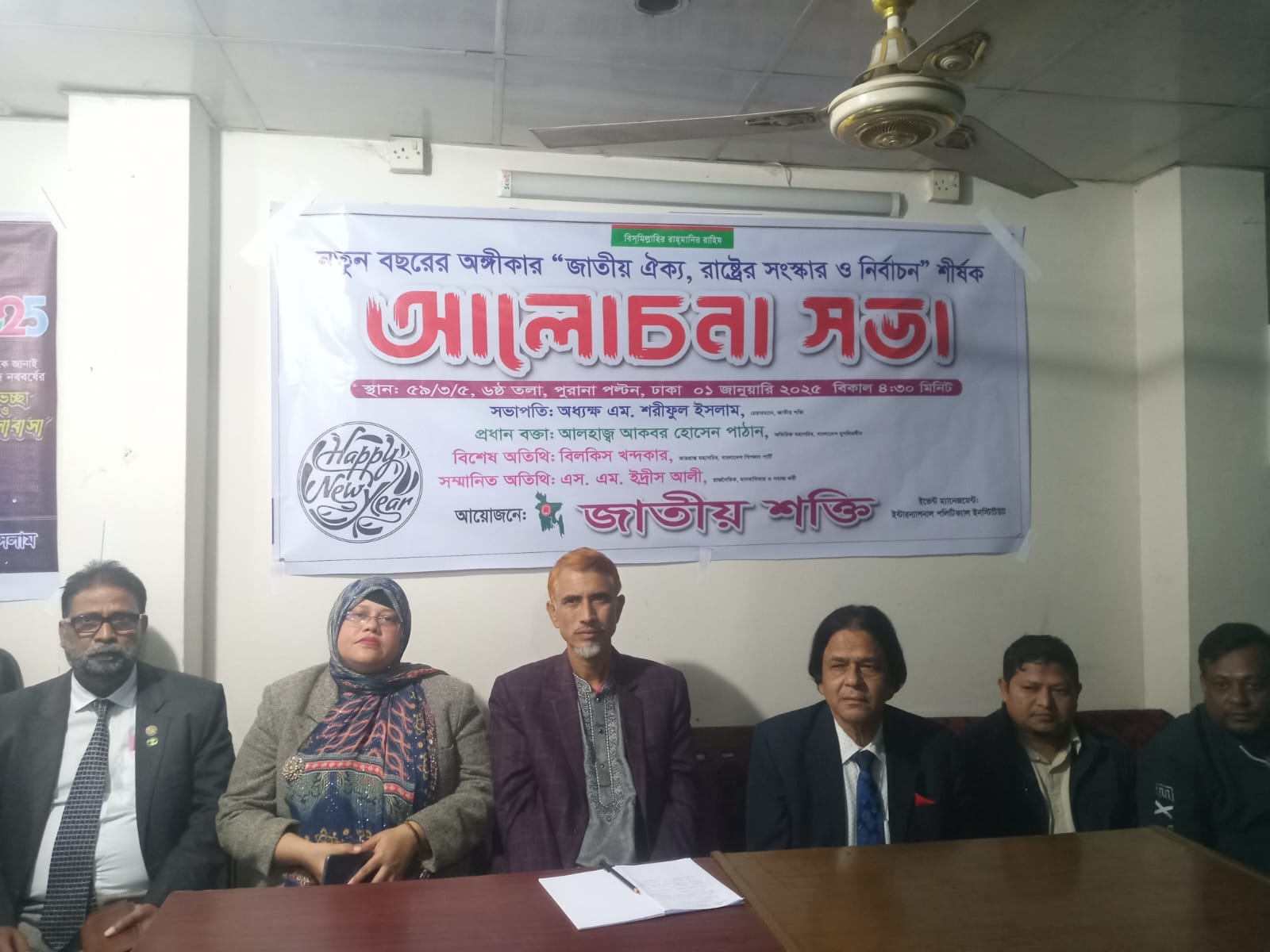 নিজস্ব প্রতিবেদকঃ ০১ জানুয়ারি বুধবার বিকেলে পুরানা পল্টনস্থ দলীয় কার্যালয় জাতীয় শক্তির উদ্যোগে নতুন বছরের অঙ্গীকার "জাতীয় ঐক্য, রাষ্ট্রের সংস্কার ও নির্বাচন” শীর্ষক আলোচনা সভা অনুষ্ঠিত হয়। উক্ত অনুষ্ঠানে জাতীয় শক্তির চেয়ারম্যান অধ্যক্ষ এম. শরীফুল ইসলাম এর সভাপতিত্বে প্রধান বক্তা ছিলেন বাংলাদেশ মুসলিম লীগের অতিরিক্ত মহাসচিব আলহাজ্ব আকবর হোসেন পাঠান। বিশেষ অতিথি ছিলেন বাংলাদেশ পিপলস পার্টির ভারপ্রাপ্ত মহাসচিব বিলকিস খন্দকার। সম্মানিত অতিথি ছিলেন রাজনৈতিক, মানবাধিকার ও সমাজ কর্মী এস. এম. ইদ্রীস আলী। আরো বক্তব্য রাখেন এস এম দুররুল হুদা মারুফ, মোঃ আমান উল্লাহ, মোঃ আব্দুল আলিম, কাউসার মাঝি, মোঃ জুয়েল রানা প্রমুখ।