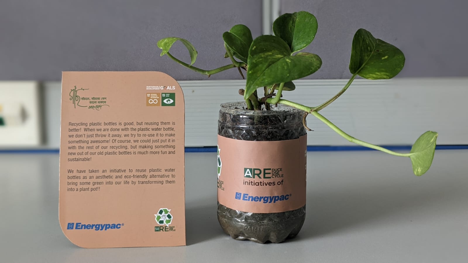 রিসাইক্লিংয়ের পাশাপাশি প্লাস্টিকের বোতলকে পুনর্ব্যবহারযোগ্য করে তোলার মাধ্যমে যে কেউ তাদের সৃজনশীলতার প্রকাশ করতে পারেন। টেকসই পরিবেশগত ভারসাম্য ও সবুজের সৌন্দর্য্য রক্ষার্থে সৃজনশীল এক উদ্যোগের আওতায় এখন এনার্জিপ্যাক তাদের ব্যবহৃত প্রতিটি প্লাস্টিক বোতলকে গাছ লাগানোর পাত্রে পরিণত করতে যাচ্ছে।