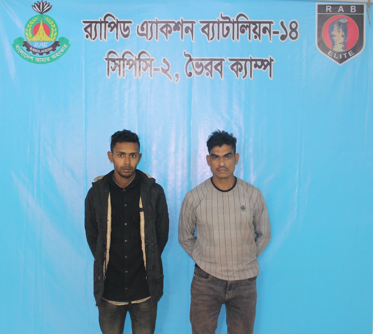 আটককৃত ব্যক্তিরা হলেন ভৈরবপুর উত্তর পাড়ার এলাকার সাজিদ মিয়ার ছেলে জুম্মান একই এলাকার খলিলুর রহমানের ছেলে রবিন উভয়ের বিরুদ্ধে ভৈরব থানায় একাদিক মামলা রয়েছে
