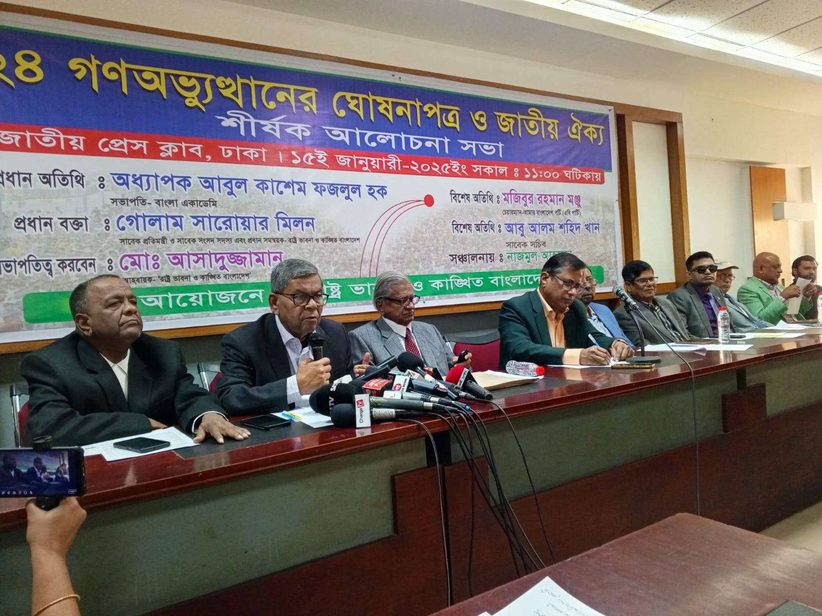 সভায় প্রধান অতিথি হিসেবে উপস্থিত ছিলেন বাংলা একাডেমির সভাপতি অধ্যাপক আবুল কাশেম ফজলুল হক প্রধান বক্তা হিসেবে উপস্থিত ছিলেন সাবেক প্রতিমন্ত্রী ও সাবেক সংসদ সদস্য রাষ্ট্র ভাবনা ও কাঙ্খিত বাংলাদেশএর প্রধান সমন্বয়ক গোলাম সারোয়ার মিলন। বক্তব্য রাখেন সাবেক সচিব মাসুদ আহমেদ, আবু আলম শহিদ খান, জাতীয় প্রেস ক্লাবের সাবেক সভাপতি শওকত মাহমুদ, বেগম রোকেয়া বিশ্ববিদ্যালয়ের সাবেক উপাচার্য প্রফেসর ড. নাজমুল আহসান কলিমউল্লাহ, গণফ্রন্ট সাধারণ সম্পাদক এডভোকেট আহমেদ আলী শেখ, এবিএম ওয়ালিউর রহমান খান প্রমুখ। সংগঠনের আহবায়ক আসাদুজ্জামানের সভাপতিত্বে সদস্য সচিব নুরুল কাদের সোহেল স্বাগত বক্তব্য রাখেন।