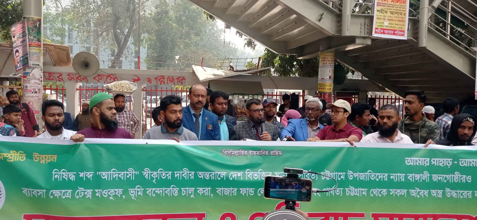 নিজস্ব প্রতিবেদকঃ বাংলাদেশের সাংবিধানিকভাবে নিষিদ্ধ শব্দ আদিবাসীকে বাংলাদেশের পাঠ্যপুস্তকের ব্যবহারের প্রতিবাদে আন্দোলনরত শিক্ষার্থীদের ওপর গত ১৫ই জানুয়ারি এনসিটিভি ভবনের সামনে উপজাতীয় "পাহাড়িরা ছাত্র পরিষদ" ও বামপন্থী সন্ত্রাসীরা অত্যন্ত নিশংসভাবে হামলা করে এবং পরবর্তীতে মিথ্যা মামলা করে তার প্রতিবাদে পার্বত্য চট্টগ্রাম নাগরিক পরিষদের উদ্যোগে ২০ জানুয়ারি, সোমবার সকাল ১১ টায় ঢাকার জাতীয় প্রেসক্লাবের সামনে মানববন্ধন ও প্রতিবাদ সমাবেশ করেন।