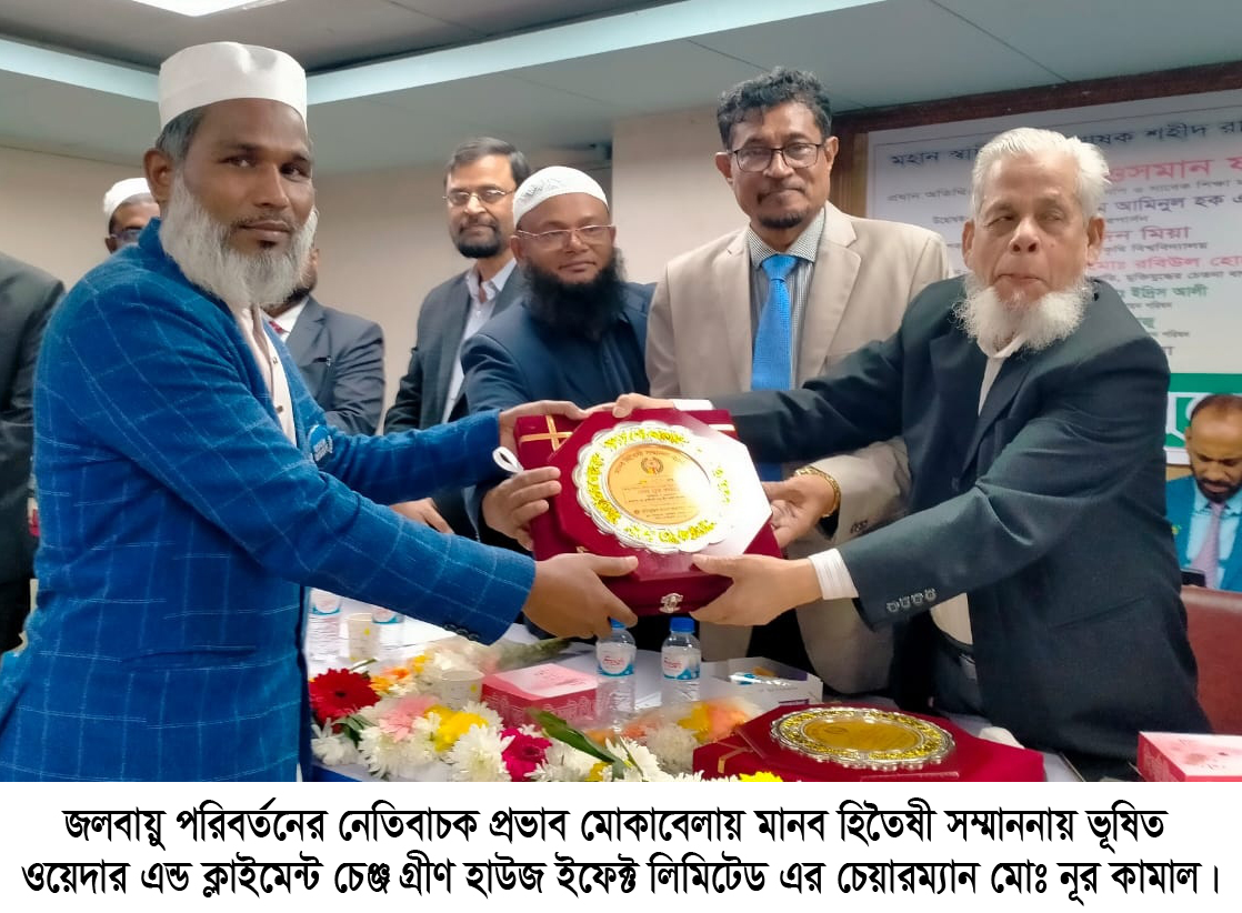 নিজস্ব প্রতিবেদকঃ জলবায়ু পরিবর্তনের নেতিবাচক প্রভাব মোকাবেলায় বিশেষ অবদানের স্বীকৃতিস্বরূপ মানব হিতৈষী সম্মাননা পেলেন ওয়েদার এন্ড ক্লাইমেন্ট চেঞ্জ গ্রীণ হাউজ ইফেক্ট লিমিটেড এর চেয়ারম্যান মোঃ নূর কামাল। মুক্তিযুদ্ধের চেতনা বাস্তবায়ন পরিষদের উদ্যোগে ২৫ জানুয়ারি ২০২৫, শনিবার বিকাল ৪.৩০ মিনিটে ডিপ্লোমা ইঞ্জিনিয়ার্স ইনস্টিটিউট কাকরাইল ঢাকা এর সেমিনার হলে মহান স্বাধীনতার ঘোষক শহীদ রাষ্ট্রনায়ক জিয়াউর রহমান বীরউত্তম এর ৮৯তম জন্মবার্ষিকী উপলক্ষে আলোচনা সভায় তাকে এ সম্মাননা প্রদান করা হয়।
