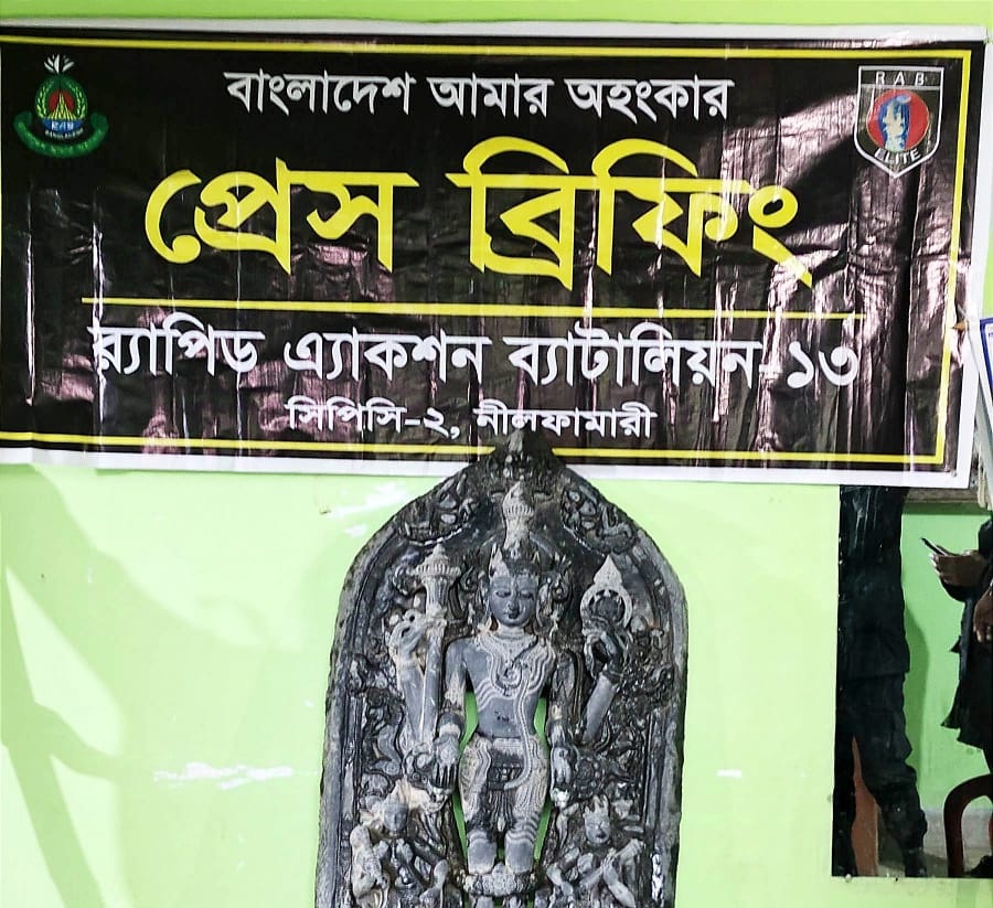 থানা সূত্রে জানা গেছে, র্যাব-১৩ সিপিসি-২ নীলফামারী মেজর ইসতিয়াকের নেতৃত্বে বীরগঞ্জ থানা পুলিশের সহযোগিতায় গোপন সংবাদের ভিত্তিতে ৪ ফ্রেব্রুয়ারী রাত ১০টার দিকে যৌথ অভিযানে শতগ্রাম ইউনিয়নের অর্জুনাহার এলাকার কৃষক মৃত ছমির আলীর ছেলে গোলাম মোর্শেদের বাড়ীর গোয়াল ঘরের পিছনে গর্ত করে পলিথিন প্যাচিয়ে রাখা কালো কষ্টি পাথরের বিষ্ণু মূর্তিটি মাটি খুড়ে উদ্ধার করা হয়।
