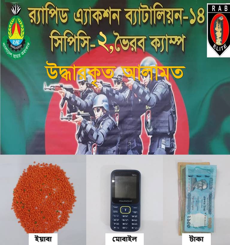 র্যাব-১৪ সূত্রে জানাযায় শনিবার (২২ ফেব্রুয়ারি) দুপুরে ভৈরব ক্যাম্পের একটি আভিযানিক দল বাসষ্ট্যান্ড মেসার্স মোল্লা গ্লাস হাউজ" দোকানের সামনে চেকপোস্ট অভিযান পরিচালনা করে ২১২৫ পিস ইয়াবা ট্যাবলেট'সহ এক নারীকে গ্রেফতার করা হয়। উদ্ধারকৃত মাদকদ্রব্য ইয়াবা ট্যাবলেট এর আনুমানিক অবৈধ বাজার মূল্য ৬,৩৭,৫০০/- (ছয় লক্ষ সাইত্রিশ হাজার পাঁচশত) টাকা।