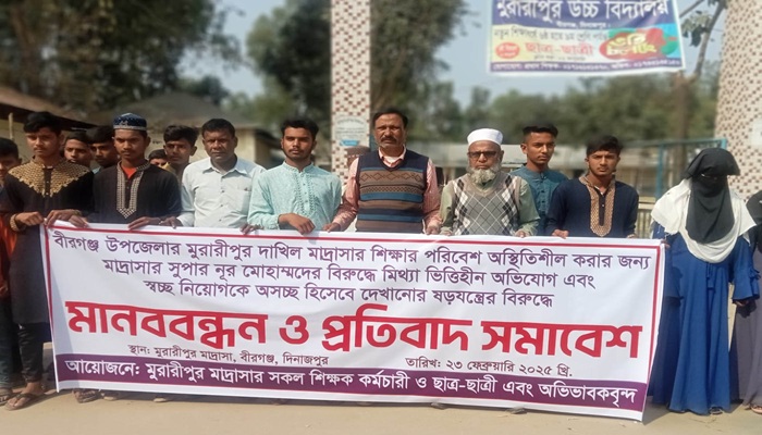 ২৩ ফেব্রূয়ারী সকাল ১১ টায় মুরারীপুর বাজার সংলগ্ন মাদ্রাসার সামনে শতশত এলাকাবাসী ঘন্টা ব্যাপী শতস্ফুর্ত প্রতিবাদ সমাবেশ ও মানবন্ধনে বক্তারা বলেন, বিধি বহির্ভূত ভূয়া নিয়োগে সহকারী সুপার গোলাম রসুল শাহী, নিরাপত্তা প্রহরি খায়রুল ইসলাম ও আয়া পারভিন আক্তার এর নিয়োগ বাতিল করণ ও দূর্নীতিবাজ সভাপতি এবং মাদ্রাসা সুপারের শাস্তি নিশ্চিত করার দাবী জানান।