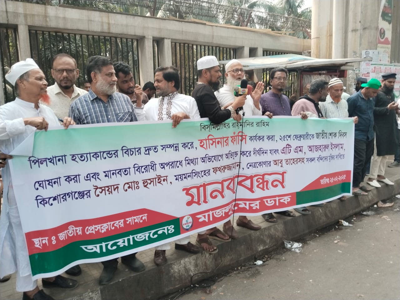২৫ ফেব্রুয়ারি মঙ্গলবার সকাল ১০.৩০ মিনিটে জাতীয় প্রেসক্লাবের সামনে মাজলুমের ডাক আয়োজিত পিলখানা হত্যাকান্ডের বিচার দ্রুত সম্পন্ন করে, হাসিনার ফাঁসি কার্যকর করা, ২৫ শে ফেব্রুয়ারীকে জাতীয় শোক দিবস ঘোষনা করা এবং মানবতা বিরোধী অপরাধে মিথ্যা অভিযোগে অভিযুক্ত করে দীর্ঘদিন যাবৎ এটি এম, আজহারুল ইসলাম, কিশোরগঞ্জের সৈয়দ মোঃ হুসাইন, ময়মনসিংহের ফখরুজ্জামান, নেত্রকোণার আবু তাহেরসহ সকল বন্দিদের মুক্তির দাবিতে মানববন্ধন অনুষ্ঠিত হয়।