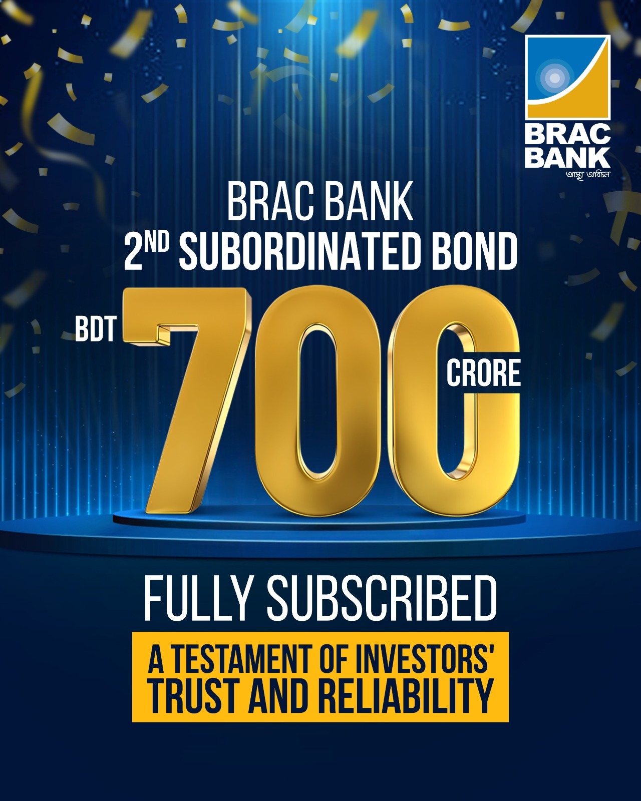 ৭০০ কোটি টাকার সাবঅর্ডিনেটেড বন্ড ইস্যুর মাধ্যমে ক্যাপিটাল বেস বাড়ালো ব্র্যাক ব্যাংক। ব্যাসেল-৩ গাইডলাইন অনুযায়ী এই বন্ড ইস্যু সম্পন্ন হয়েছে।
