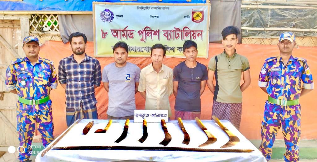 ইমরান আল মাহমুদ,উখিয়া: ক্যাম্পে গভীররাতে ডাকাতির প্রস্তুতিকালে অস্ত্রসহ পাঁচজন রোহিঙ্গাকে গ্রেফতার করেছে ৮ আর্মড পুলিশ ব্যাটালিয়ন(এপিবিএন) সদস্যরা। এসময় গ্রেফতার রোহিঙ্গাদের থেকে বিপুল পরিমাণ দেশীয় অস্ত্র উদ্ধার করা হয় বলে নিশ্চিত করেছেন ৮ এপিবিএন অতিরিক্ত পুলিশ সুপার(মিডিয়া) মো. কামরান হোসেন।