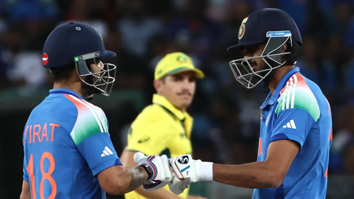 এর আগে ওপেনিংয়ে ৩০ বলে ৩০ রানের জুটি এনে দেন অধিনায়ক রোহিত শর্মা ও শুভমান গিল। ২৯ বলে ২৮ রানে বিদায় নেন রোহিত, গিল করেন ১১ বলে ৮। মাঝে কোহলির সঙ্গে মিলে অস্ট্রেলিয়ার আত্মবিশ্বাস ভাঙেন শ্রেয়াস আইয়ার। ৬২ বলে ৪৫ করেন শ্রেয়াস। অক্ষরের প্যাটেল খেলেন ৩০ বলে ২৭ রানের সময়োপযোগী ইনিংস।