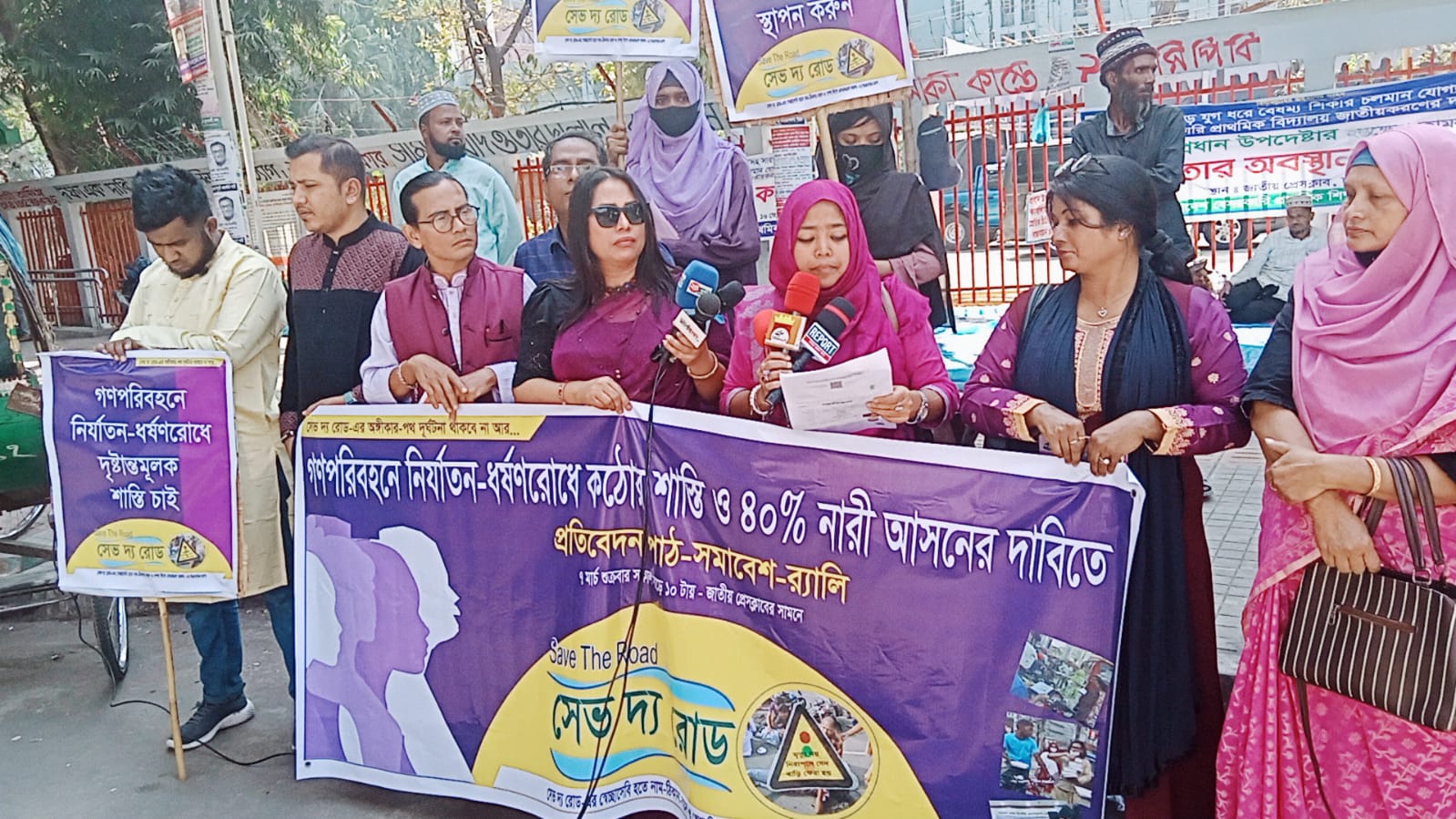 ৭ মার্চ বেলা সাড়ে ১০ টায় জাতীয় প্রেসক্লাবের সামনে অনুষ্ঠিত কর্মসূচিতে লিখিত প্রতিবেদনে তিনি আরো জানান, গত ১ বছরে রেলপথে ৫৬২ টি নির্যাতন, ১১ টি ধর্ষণ; সড়কপথে ৪১৩ টি নির্যাতন ও ২০ টি ধর্ষণ; নৌপথে ৩২৫ টি নির্যাতন ও ৫ টি ধর্ষণ এবং রেল-নৌ-বাস স্টেশন ও ফুটপাতে ৪৫৮ টি নির্যাতন ও ৫ টি ধর্ষণের ঘটনা ঘটেছে। সেভ দ্য রোড-এর প্রতিষ্ঠাতা মোমিন মেহেদীর সভাপতিত্বে এতে বক্তব্য রাখেন সেভ দ্য রোড-এর ভাইস চেয়ারম্যান সোনিয়া দেওয়ান প্রীতি, সদস্য ওয়াজেদ রানা, কন্ঠশিল্পী রিয়া খান, রিয়াদ ইসলাম, কাজী মুন্নী আলম, মেহেদী হাসান, মোনালিসা দেওয়ান অশ্রু প্রমুখ।