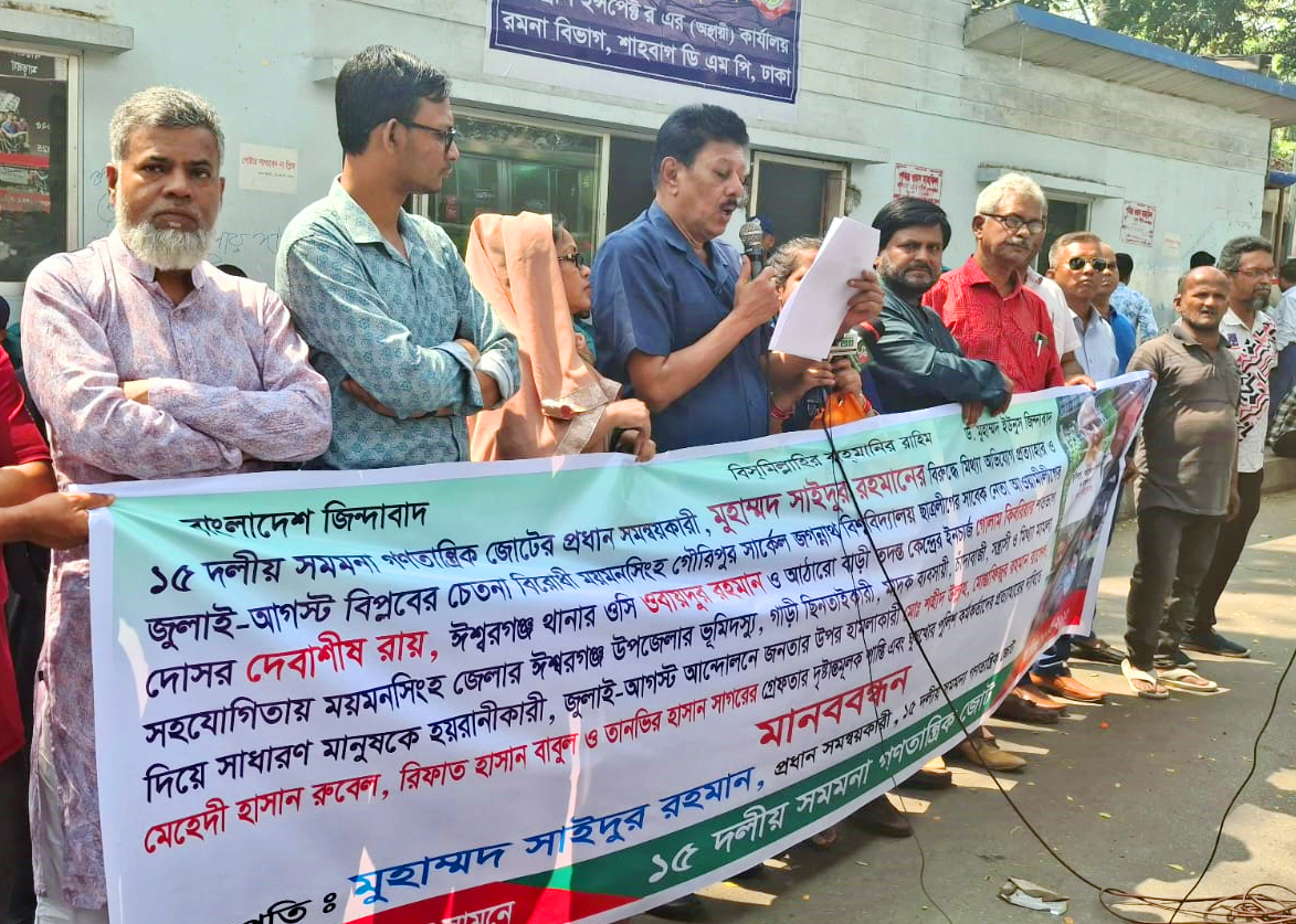১২ মার্চ বুধবার সকালে জাতীয় প্রেসক্লাবের সামনে ১৫ দলীয় সমমনা গণতান্ত্রিক জোটের প্রধান সমন্বয়কারী মুহাম্মদ সাইদুর রহমানের বিরুদ্ধে মিথ্যা অভিযোগ প্রত্যাহার ও জুলাই-আগস্ট বিপ্লবের চেতনা বিরোধী ময়মনসিংহ উত্তর গৌরিপুর সার্কেল জগন্নাথ বিশ্ববিদ্যালয় ছাত্রলীগের সাবেক নেতা দেবাশীষ রায়, ঈশ্বরগঞ্জ থানার ওসি ওবায়দুর রহমান ও আঠারো বাড়ী তদন্ত কেন্দ্রের ইনচার্জ গোলাম কিবরিয়ার শতভাগ সহযোগিতায় ময়মনসিংহ উত্তর জেলার ভূমিদস্যু, গাড়ী ছিনতাই, মাদক ব্যবসায়ী, চাঁদাবাজী, সন্ত্রাসী ও মিথ্যা মামলা দিয়ে সাধারণ মানুষকে হয়রানীকারী, জুলাই-আগস্ট আন্দোলনে জনতার উপর হামলাকারী মোঃ শহীদ উল্লাহ, মোস্তাফিজুর রহমান রাসেল, মেহেদী হাসান রুবেল, রিফাত হাসান বাবুল ও তানভির হাসান সাগরের দৃষ্টান্তমূলক শাস্তি এবং সংশ্লিষ্ট পুলিশ কর্মকর্তাদের প্রত্যাহারের দাবিতে মানববন্ধন কর্মসূচি অনুষ্ঠিত হয়।