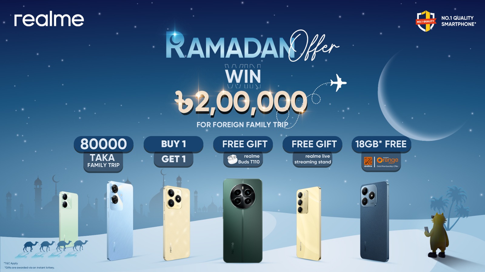 নিজস্ব প্রতিবেদকঃ পবিত্র রমজানে বাংলাদেশের গ্রাহকদের জন্য অসাধারণ সব অফার ও চমক নিয়ে হাজির হয়েছে অন্যতম জনপ্রিয় স্মার্টফোন ব্র্যান্ড রিয়েলমি। এ রমজানকে স্মরণীয় করে রাখতে ব্র্যান্ডটি গ্রাহকদের জন্য সবচেয়ে বড় চমক হিসেবে অফার করছে দেশের বাইরে ২ লাখ টাকা সমমূল্যের ফ্যামিলি ট্যুর এবং দেশের অভ্যন্তরে ৮০ হাজার টাকা সমমূল্যের ফ্যামিলি ট্যুরও।