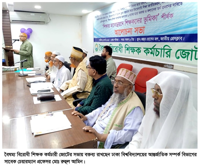 নিজস্ব প্রতিবেদকঃ আসন্ন ঈদে শতভাগ উৎসব ভাতার দাবি, শিক্ষায় বৈষম্য নিরসনে শতভাগ উৎসব ভাতা, সরকারি নিয়মে বাড়িভাড়া, মেডিকেল ভাতা, সর্বজনীন বদলি, ইবতেদায়ির নীতি মালা দ্রুত বাস্তবায়ন, ননএমপিও শিক্ষা প্রতিষ্ঠান এমপিওভুক্ত করা, অবসরের ৬মাসের মধ্যে অবসর ও কল্যানের অর্থ প্রদানের দাবিতে ১৫ মার্চ জাতীয় প্রেসক্লাবে প্রেসক্লাবের জহুর হোসেন হল অধ্যক্ষ মোঃ মাঈনউদ্দিনের সভাপতিত্বে উপাধ্যক্ষ মোঃ আবদুর রহমানের সঞ্চালনায় শিক্ষার মানোন্নয়ন শিক্ষকদের ভূমিকা শীর্ষক আলোচনা মুল প্রবন্ধ উপস্থাপন করেন জাতীয় শিক্ষক ফোরামের কেন্দ্রীয় কমিটির সভাপতি অধ্যাপক মোঃ নাসির উদ্দিন খান।