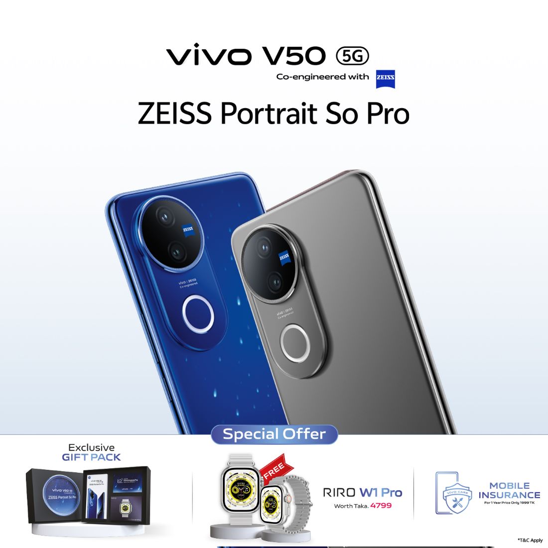 ১৬ মার্চ থেকে শুরু হওয়া ফার্স্ট সেলের অফারে ভিভো ভি৫০ ফাইভজি কিনলেই গিফট হিসেবে ভিভো দিচ্ছে রিরো ডব্লিউ১ প্রো (মূল্য ৪,৭৯৯ টাকা) ও পোস্ট কার্ড। এছাড়াও মোবাইল ইন্স্যুরেন্সের (মূল্য ১,৯৯৯ টাকা) সুবিধাটি পাওয়া যাবে সম্পূর্ণ এক বছরের জন্য। ৬২,৯৯৯ টাকায় পাওয়ারফুল ব্যাটারির এ ফোন পাওয়া যাচ্ছে ভিভোর অফিসিয়াল ই-স্টোর অথবা যে কোনো অথরাইজড শপে।