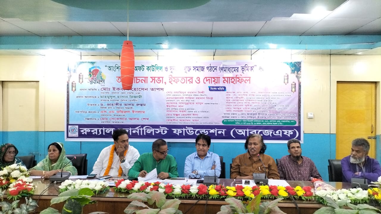 নিজস্ব প্রতিবেদকঃ রুর্যাল জার্নালিস্ট ফাউন্ডেশন (আরজেএফ) এর উদ্যোগে মহান স্বাধীনতা দিবস উদযাপন উপলক্ষে ১৭ মার্চ সোমবার বিকেলে বাংলাদেশ শিশু কল্যাণ পরিষদ কনফারেন্স রুম, ঢাকায় আংশিক কো-অফট কাউন্সিল, দুর্নীতি মুক্ত সমাজ গঠনে গণমাধ্যমের ভূমিকা শীর্ষক আলোচনা সভা, ইফতার ও দোয়া মাহফিল অনুষ্ঠানের আয়োজন করা হয়।