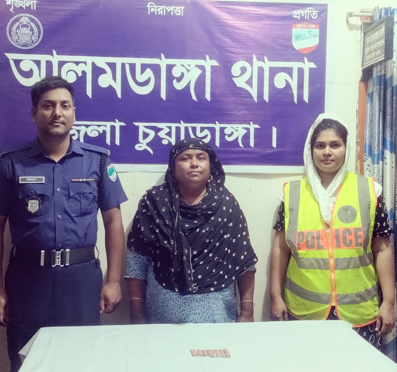 নিজস্ব প্রতিবেদকঃ চুয়াডাঙ্গা জেলা পুলিশের মাদক ও চোরাচালান বিরোধী অভিযানের অংশ হিসেবে আলমডাঙ্গা থানার পুলিশ বিশেষ অভিযান চালিয়ে কুখ্যাত মাদক কারবারি মোছাঃ মিনি বেগমকে গ্রেফতার করেছে। পুলিশ সুপার খন্দকার গোলাম মওলা, বিপিএম-সেবা মহোদয়ের নির্দেশনায় ও আলমডাঙ্গা থানার অফিসার ইনচার্জ মুহাঃ মাসুদুর রহমানের তত্ত্বাবধানে এসআই (নিঃ) শীতল বিশ্বাস সঙ্গীয় ফোর্সসহ গত ৩১ মার্চ রাত ১১:৩৫ মিনিটে আলমডাঙ্গা পৌরসভার গোবিন্দপুর মাঠপাড়া গ্রামের রাইস মিলের সামনে থেকে তাকে মাদক বিক্রির সময় হাতেনাতে আটক করে। এসময় তার কাছ থেকে ৪০ পিস ট্যাপেন্টাডল (Tapentadol) ট্যাবলেট ও মাদক বিক্রির নগদ ৩,৯৫০ টাকা উদ্ধার করা হয়। গ্রেফতারকৃত আসামীর বিরুদ্ধে আলমডাঙ্গা থানায় মাদকদ্রব্য নিয়ন্ত্রণ আইনে মামলা রুজু করা হয়েছে।