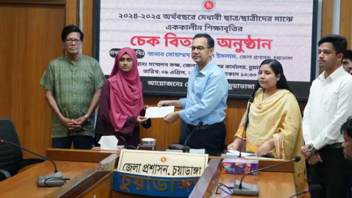 বুধবার (৯ এপ্রিল) সকাল সাড়ে ১০টায় জেলা প্রশাসকের কার্যালয়ের সম্মেলন কক্ষে আয়োজিত অনুষ্ঠানে প্রধান অতিথি হিসেবে উপস্থিত থেকে শিক্ষার্থীদের হাতে চেক তুলে দেন চুয়াডাঙ্গার জেলা প্রশাসক মোহাম্মদ জহিরুল ইসলাম।