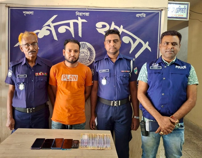 ৮ এপ্রিল ২০২৫ তারিখ রাত ১০ টার সময় দর্শনা থানাধীন পুরাতন বাজার ‘দোয়েল মেডিকেল হল’ এলাকা থেকে প্রতারক চক্রের সদস্য দর্শনা দক্ষিণ চাঁদপুর (স্কুলপাড়ার) মোঃ তাইজুল ইসলাম এর ছেলে মোঃ তাকবির ইসলাম রিয়াদ (৩০) কে হাতেনাতে নগদ ২৫,০০০ টাকাসহ গ্রেফতার করা হয়।