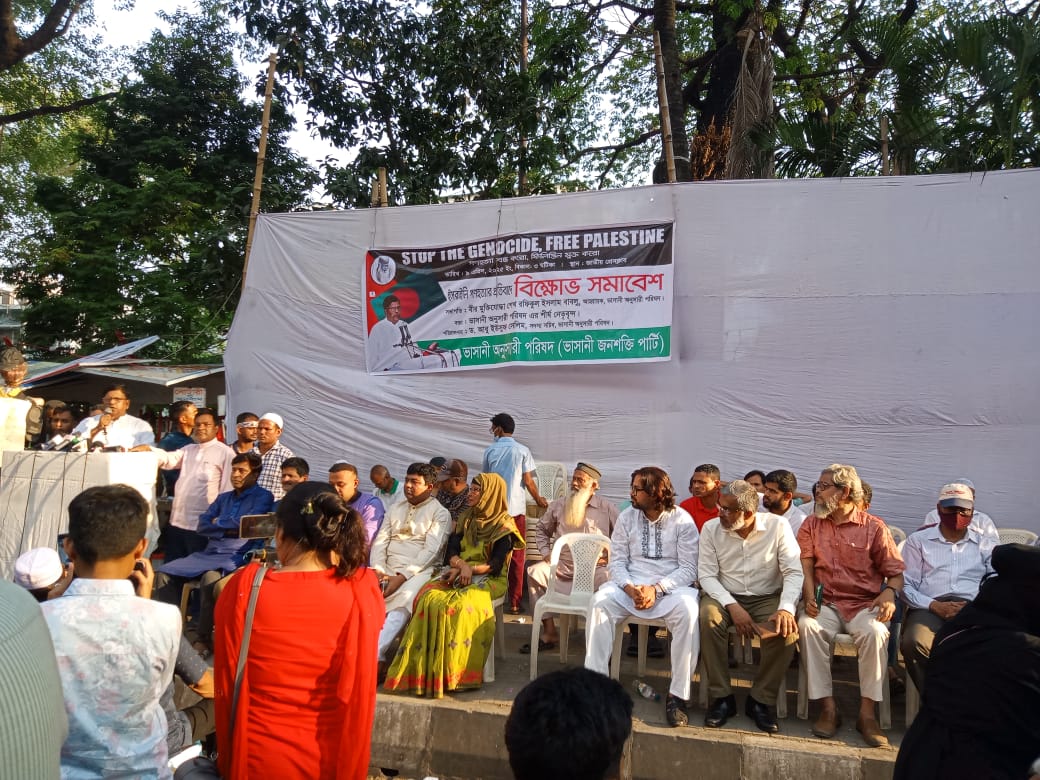 বিক্ষোভ সমাবেশে ভাসানী অনুসারী পরিষদ এর আহবায়ক বীর মুক্তিযোদ্ধা মোঃ রফিকুল ইসলাম বাবলু সভাপতিরবক্তব্যে বলেন, ফিলিস্তিনের নিরীহ জনগণের উপর ইসরায়েলের বর্বরোচিত হামলা, গনহত্যা, লুটপাট এবং দখল দারিত্ব অবিলম্বে বন্ধ করতে হবে। সেখানে শিশুদের সহ সকল মানুষকে যেভাবে হত্যা করা হচ্ছে সেটি ভয়াবহ, অকল্পনীয়, অগ্রহণযোগ্য। আমি আমেরিকা সহ বিশ্ব নেতৃত্বকে অনুরোধ করবো এখনই দখলদার ইসরায়েল কে এ হামলা বন্ধ করার জন্য চাপ প্রয়োগ করেন। তাদের খাদ্য ও চিকিৎসার ব্যবস্থা করেন। বাংলাদেশের মানুষ সবসময় ফিলিস্তিনের জনগণের পাশে থাকবে। সরকারের উচিৎ ফিলিস্তিনের জনগণের জন্য অর্থ সহায়তা, খাদ্য সহায়তা এবং চিকিৎসা সহায়তা পাঠানো।বিশ্ব শান্তি প্রতিষ্ঠায় ইসরায়েলকে ফিলিস্তিন এর উপর হামলা বন্ধ করতেই হবে।