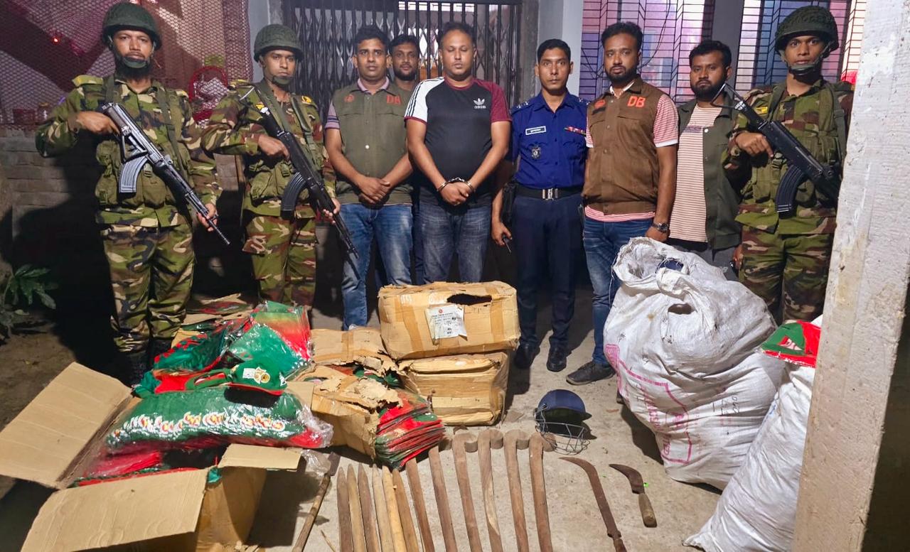 এ সময় যৌথবাহিনি তার বাড়ি ও দোকানে তল্লাশি চালিয়ে ০৭ টি দেশিয় অস্ত্র (রামদা), ১০টি ভল্লম, হকিস্টিক, বহুমুখী হেলমেট ও বিপুল পরিমান ক্যাপসহ মুজিব টি-শার্ট উদ্ধার করে।