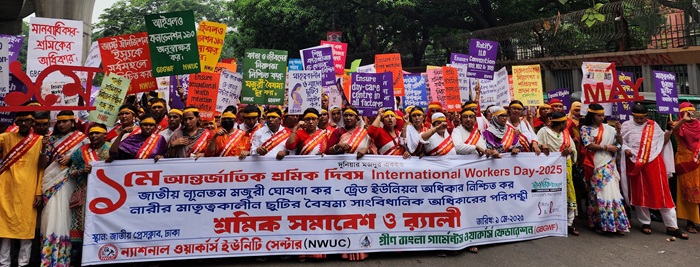 নিজস্ব প্রতিবেদকঃ আজ ১লা মে-২০২৫ইং রোজ বৃহস্পতিবার সকাল ১০:৩০টায় জাতীয় প্রেসক্লাবের সামনে আন্তর্জাতিক শ্রমিক দিবস-২০২৫ উপলক্ষে নারীর মাতৃত্বকালীন ছুটির বৈষম্য সাংবিধানিক অধিকারের পরিপন্থী ও জাতীয় ন্যূনতম মজুরী ঘোষণা কর - ট্রেড ইউনিয়ন অধিকার নিশ্চিত করার দাবীতে গ্রীণ বাংলা গার্মেন্টস ওয়ার্কার্স ফেডারেশন ও ন্যাশনাল ওয়ার্কার্স ইউনিটি সেন্টার এর যৌথ উদ্যোগে শ্রমিক সমাবেশ ও র্যালি অনুষ্ঠিত।