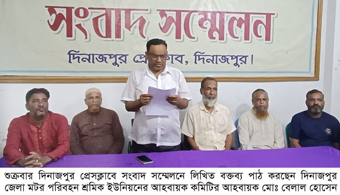 শুক্রবার দিনাজপুর প্রেসক্লাবে এক সংবাদ সম্মেলনের মাধ্যমে নির্বাচন সাময়িক স্থগিত করার ঘোষনা দেন দিনাজপুর জেলা মটর পরিবহন শ্রমিক ইউনিয়নের আহবায়ক মোঃ বেলাল হোসেন ও যুগ্ম আহবায়ক সৈয়দ শওকত আলী তোতা।