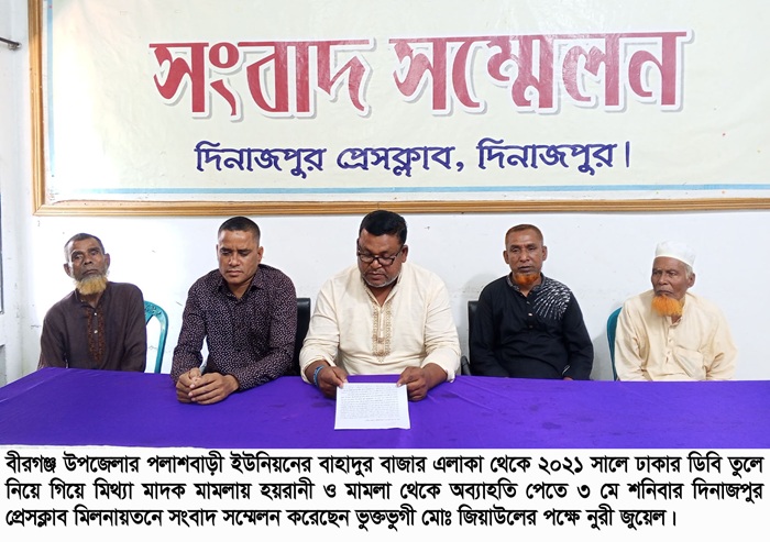 দিনাজপুর প্রতিনিধি: দিনাজপুরের বীরগঞ্জ উপজেলার পলাশবাড়ী ইউনিয়নের বাহাদুর বাজারের হীরামনি এলাকা থেকে ২০২১ সালে ঢাকার ডিবি তুলে নিয়ে গিয়ে মিথ্যা মাদক মামলায় হয়রানী করছে। মামলা থেকে অব্যাহতি পেতে দিনাজপুর প্রেসক্লাব মিলনায়তনে সংবাদ সম্মেলন করেছেন ভুক্তভুগী মোঃ জিয়াউল।
