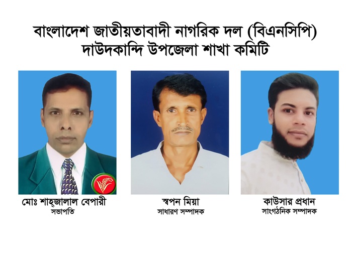 নিজস্ব প্রতিবেদকঃ ৪ মে ২০২৫, রবিবার বাংলাদেশ জাতীয়তাবাদী নাগরিক দল (বিএনসিপি) কেন্দ্রীয় কার্যনির্বাহী কমিটির সভাপতি শাহজাদা সৈয়দ মোঃ ওমর ফারুক পীরসাহেব ও সাধারণ সম্পাদক আলহাজ্ব এডভোকেট জাবেদ ইকবাল সাহেবের যৌথ স্বাক্ষরে কুমিল্লা জেলাধীন বাংলাদেশ জাতীয়তাবাদী নাগরিক দল (বিএনসিপি) দাউদকান্দি উপজেলা শাখা ১২১ সদস্য বিশিষ্ট কমিটির তালিকা প্রকাশ করা হয়।