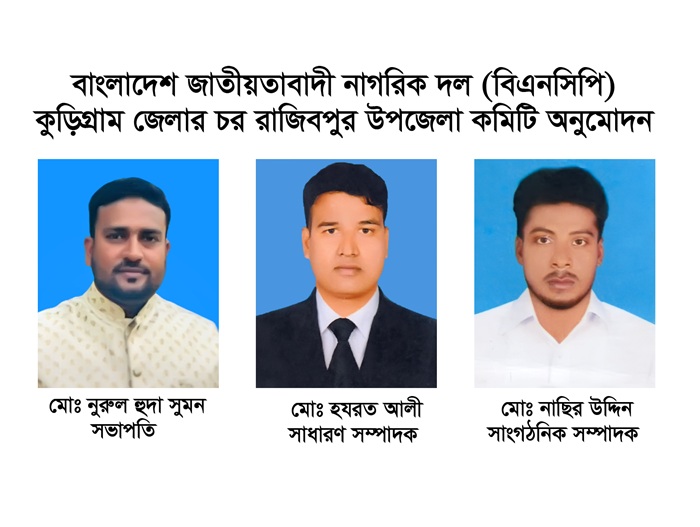 বাংলাদেশ জাতীয়তাবাদী নাগরিক দল (বিএনসিপি) কুড়িগ্রাম জেলাধীন চর রাজিবপুর উপজেলা কমিটি ডিসেম্বর ২০২৭ পর্যন্ত অনুমোদন করা হলো।