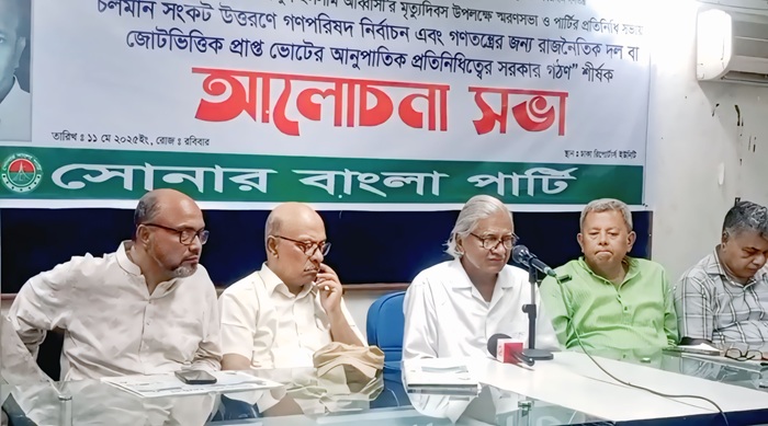 আলোচনা সভায় প্রধান অতিথির বক্তব্যে ঢাকা বিশ্ববিদ্যালয়ের সাবেক শিক্ষক, বাংলা একাডেমির সভাপতি সমাজ ও রাষ্ট্রচিন্তক অধ্যাপক আবুল কাসেম ফজলুল হক বলেন- আনুপাতিক প্রতিনিধিত্বের সরকার গঠন করার লক্ষ্যে রাজনৈতিক দলকে গুরুত্ব দিতে হবে এবং দায়িত্ব নিতে হবে। গণতন্ত্রের জন্য এই পদ্ধতি বা সংখ্যানুপাতিক নির্বাচনী প্রক্রিয়া সর্বদলীয় সরকার গঠনে ভূমিকা রাখবে। তিনি আরও বলেন, নিঃরাজনীতিকরণের প্রক্রিয়ায় পড়ে বাংলাদেশের রাজনীতির এখন যে দশা,তাতে এর মৌলিক পুনর্গঠন দরকার। রাজনীতিতে এখন আর রাজনীতি নেই, আছে কেবল নগ্ন ক্ষমতার লড়াই। গণতন্ত্র এখন নির্বাচনতন্ত্র। ক্ষমতা দখল করা হয় সম্পত্তি অর্জনের উদ্দেশ্যে।রাজনীতি পরিনত হয়েছে নোংরা ব্যবসায়। সর্বজনীন কল্যানে ব্যক্তি,সমাজ, জাতি ও রাষ্ট্রের আমূল পরিবর্তনে উক্ত সোনার বাংলা পার্টি ‘র আটাশ দফা কর্মসূচি।