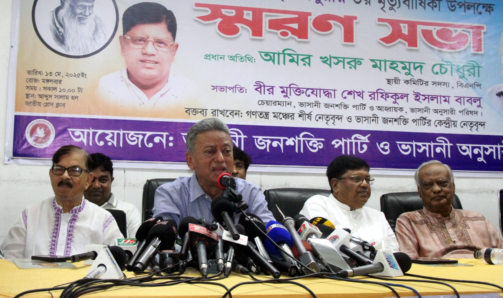 নিজস্ব প্রতিবেদকঃ আজ ১৩ মে সকাল ১১ টায় ডাঃ জাফরুল্লাহ চৌধুরীর ২য় মৃত্যুবার্ষিকী উপলক্ষে জাতীয় প্রেসক্লাবের আব্দুস সালাম হলে স্বরনসভায় ভাসানী জনশক্তি পার্টির চেয়ারম্যান এবং ভাসানী অনুসারী পরিষদ এর আহবায়ক বীর মুক্তিযোদ্ধা শেখ রফিকুল ইসলাম বাবলু সভাপতির বক্তব্যে বলেন, জাতীয় সংগীত গাইতে না দেয়ার ধৃষ্টতা স্বাধীন বাংলাদেশে মেনে নেয়া হবে না। শাহবাগে স্লোগান শুনলাম নিজামীর বাংলাদেশ, গোলাম আজমের বাংলাদেশ। তাদের বলতে চাই এই বাংলাদেশ মাওলানা ভাসানীর বাংলাদেশ, জাফরুল্লাহ চৌধুরীর বাংলাদেশ, শেখ মুজিবের বাংলাদেশ, মেজর জিয়ার বাংলাদেশ। বাংলাদেশের মানুষ ফ্যাসিস্ট হাসিনাকে বিদায় করেছে। এখন জুলাই -আগষ্টের হত্যাকান্ডের জন্য শেখ হাসিনার বিচার হতে হবে। হাসিনার সাথে যারা যারা জড়িত ছিলো তাদের বিচার হতে হবে। জাতীয় পার্টিরও বিচার হতে হবে। দেশ গভীর সংকটে আছে এই সংকটকালীন সময়ে ডাঃ জাফরুল্লাহ চৌধুরীর মতো দেশপ্রেমিক নেতৃত্বের খুব দরকার ছিলো। তার সারাজীবন তিনি মানুষের সেবায় কাটিয়েছেন।