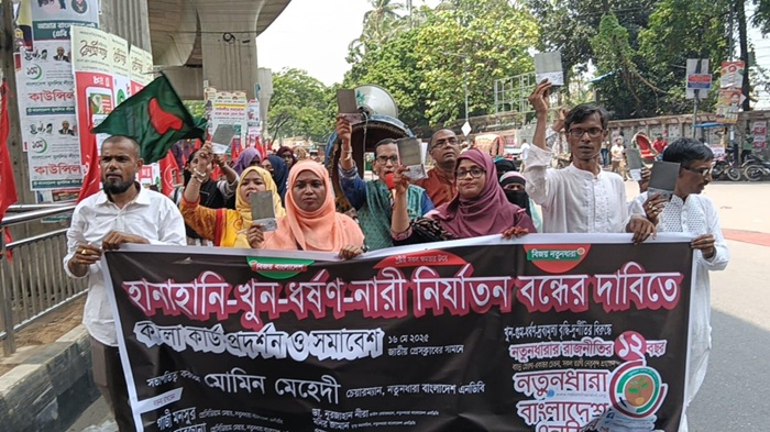নিজস্ব প্রতিবেদকঃ হানাহানি-খুন-ধর্ষণ-নারী নির্যাতন বন্ধের দাবিতে কালো কার্ড প্রদর্শন ও সমাবেশ জাতীয় প্রেসক্লাবের সামনে ১৬ মে শুক্রবার বেলা ১১ টায় অনুষ্ঠিত হয়েছে। নতুনধারা বাংলাদেশ এনডিবির চেয়ারম্যান মোমিন মেহেদীর সভাপতিত্বে এতে বক্তব্য রাখেন প্রেসিডিয়াম মেম্বার গাজী মনসুর, সিনিয়র ভাইস চেয়ারম্যান শান্তা ফারজানা, ভাইস চেয়ারম্যান ডা. নূরজাহান নীরা, ভারপ্রাপ্ত মহাসচিব নিপুন মিস্ত্রী, যুগ্ম মহাসচিব মনির জামান, সাংগঠনিক সম্পাদক ওয়াজেদ রানা, সহ-সাংগঠনিক সম্পাদক আল আমিন বৈরাগী, বিথী হাওলাদার, আবু বকর সিদ্দিক রতন, রুবেল আখন্দ, আফতাব মন্ডল, সাইফুল হক রহমান, অরবিন্দ দেবনাথ প্রমুখ।