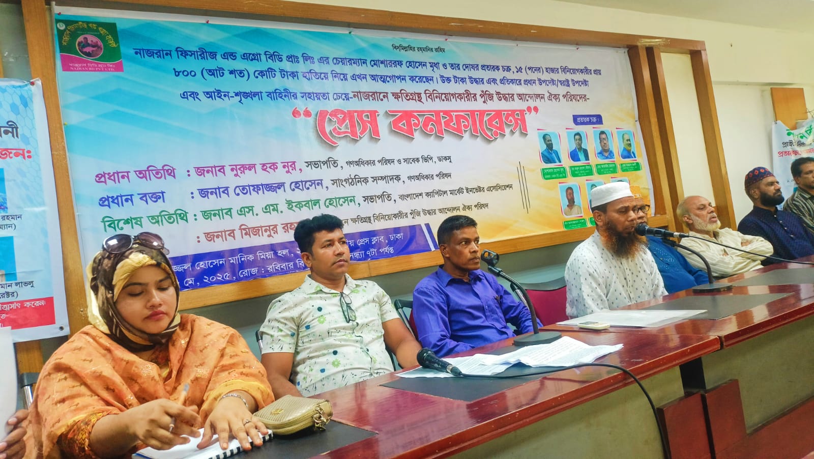 ১৮ মে রবিবার বিকালে জাতীয় প্রেসক্লাবের তফাজ্জল হোসেন মানিক মিয়া হলে নাজরান ফিসারীজ এন্ড এগ্রো বিডি লিমিটেডের ক্ষতিগ্রস্থ বিনিয়োগকারী পুঁজি উদ্ধার আন্দোলন ঐক্য পরিষদ এক সংবাদ সম্মেলন এসব কথা বলেন। অভিযুক্তদের দ্রুত গ্রেফতারের দাবী জানিয়ে সভাপতি মিজানুর রহমান বলেন, নাজরান ফিসারীজ এন্ড এগ্রো বিডি লিমিটেডের মোশাররফ হোসেন মৃধা ও তার সহচররা ১৫ হাজার বিনিয়োগকারীর ৮০০ (আট শত) কোটি টাকা হাতিয়ে নিয়ে আত্মগোপন করেছেন। আমরা বিনিয়োগকারীরা টাকা ফেরত পেতে এবং আসামিদের দ্রুত গ্রেফতাতের দাবী জানায়।